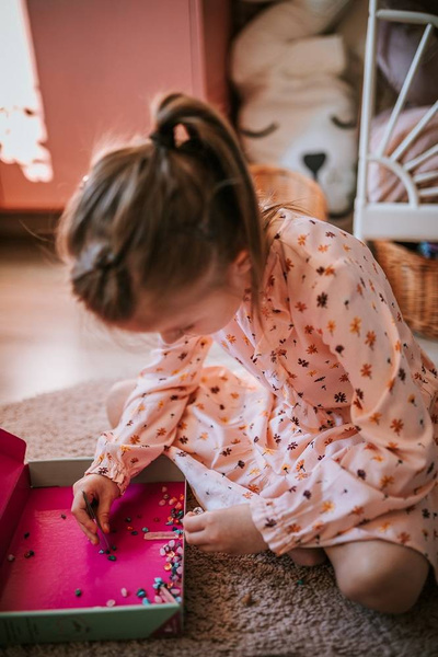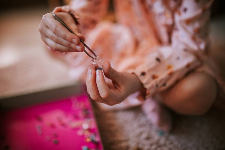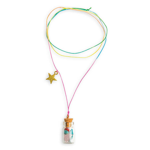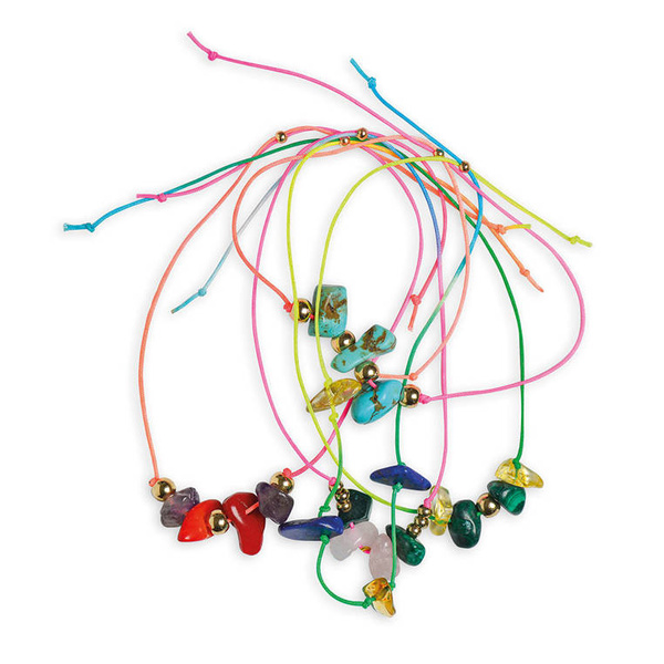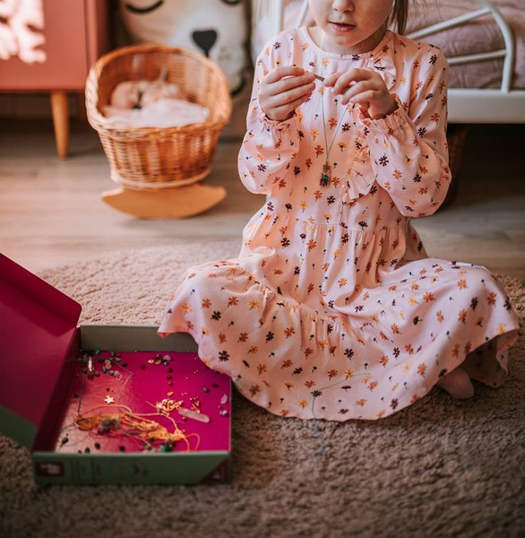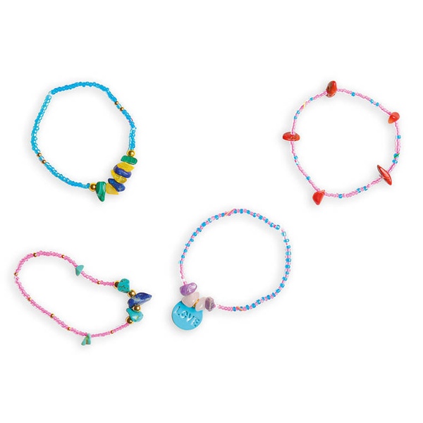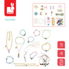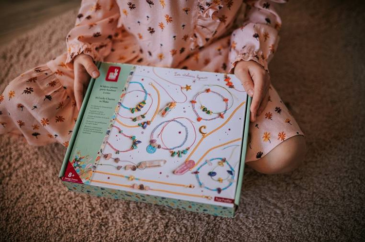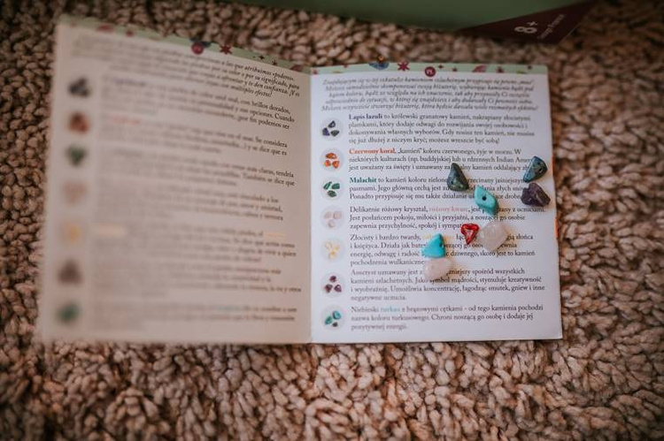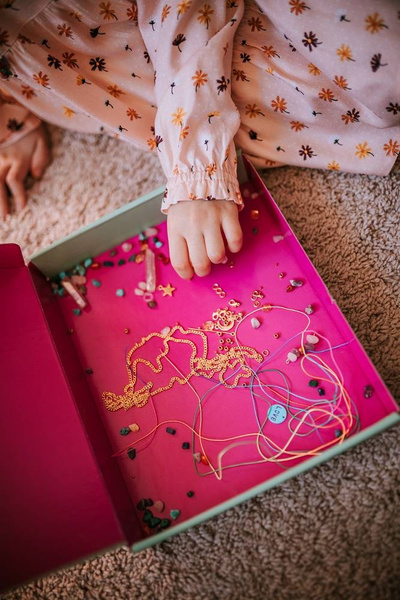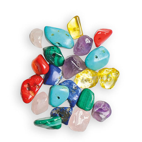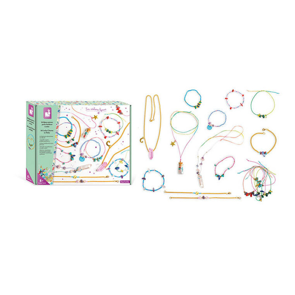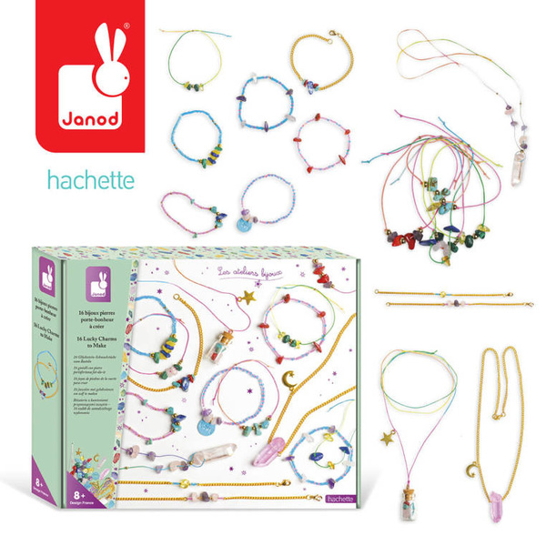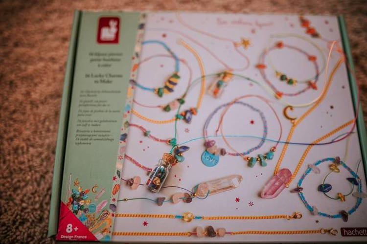 Zestaw kreatywny do tworzenia biżuterii Kryształy francuskiej marki JANOD pozwoli stworzyć w sumie aż 16 sztuk biżuterii: 3 naszyjniki i 13 bransoletek. W jego skład wchodzi 100 drobnych kamieni naturalnych w 7 kolorach, 2 większe kryształy, 44 drobne złote koraliki i mnóstwo mini-koralików, tęczowy sznurek, biała nylonowa nitka, złoty łańcuszek, 4 igiełki jubilerskie, 10 złotych kółeczek, 4 zapięcia oraz cztery pojedyncze zawieszki: złoty księżyc, złota gwiazdka, turkusowe kółeczko z napisem LOVE i fiolka z korkiem oraz szczypce do chwytania drobnych elementów. W kilka chwil Twoje dziecko może stać się kreatywnym jubilerem! Projektowanie i tworzenie biżuterii to godziny angażującej i jednocześnie uspokajającej, wyciszającej zabawy, a po skończonej pracy powstałe dzieła mogą jeszcze długo służyć jako ozdoby lub podarunki dla bliskich. Do zestawu dołączona jest szczegółowa instrukcja jak wykonać poszczególne ozdoby oraz karta z informacjami o poszczególnych kamieniach i ich funkcjach, np. ochronnej, energetyzującej itp.