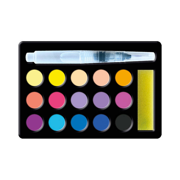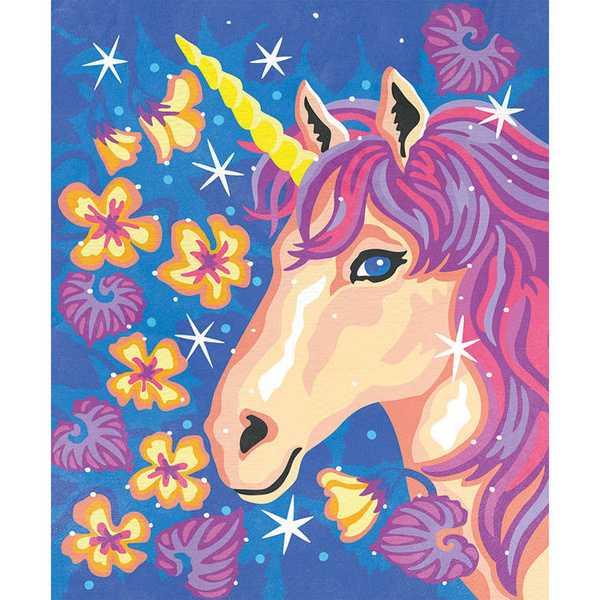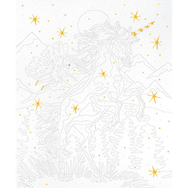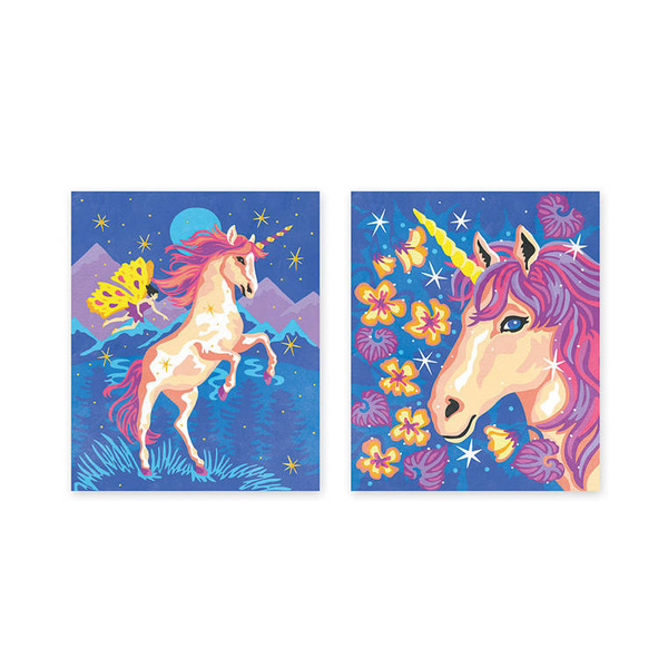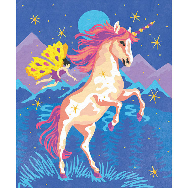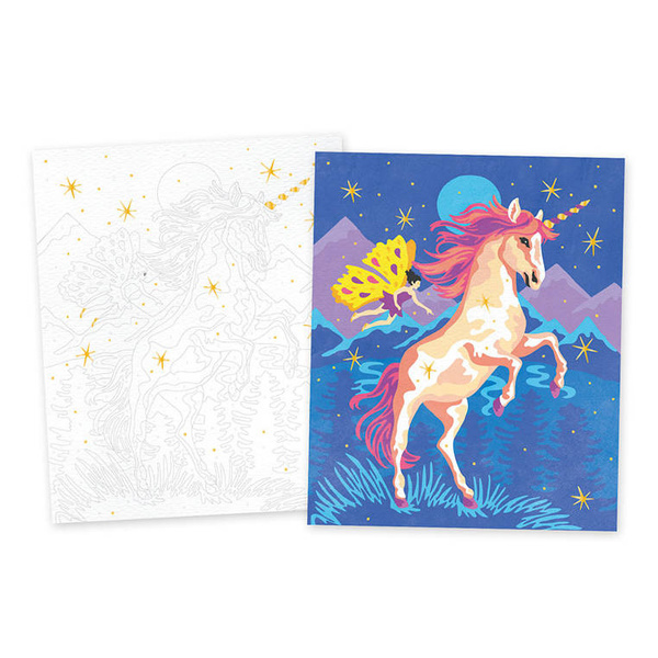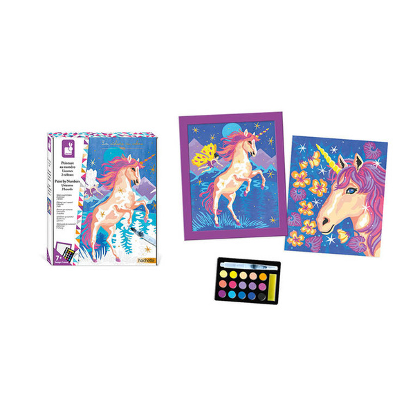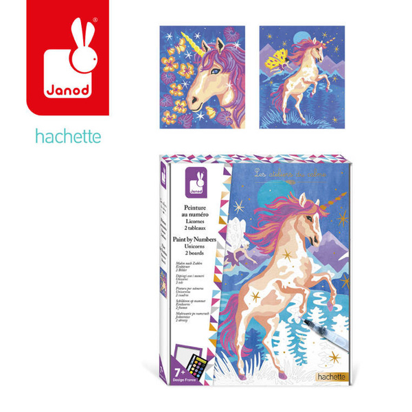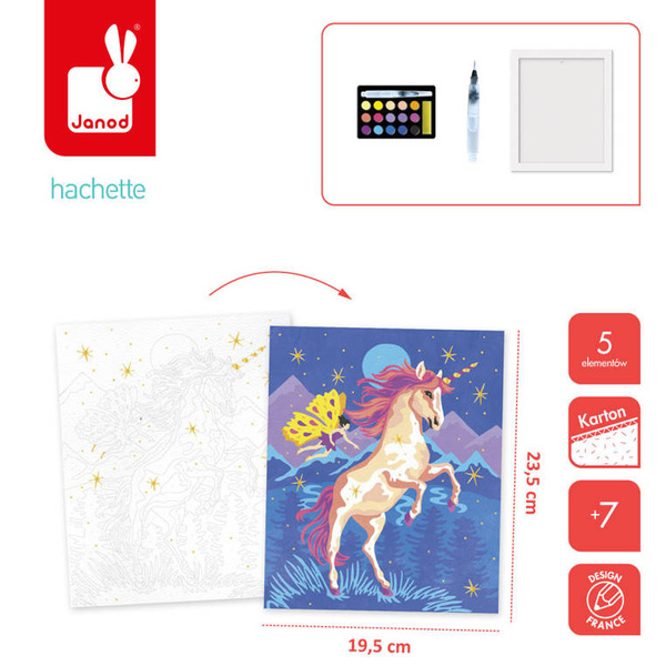 Zestaw kreatywny Malowanie po numerach Jednorożce marki JANOD zawiera 2 plansze-obrazki z tymi stworzeniami – portret z bliska i całą sylwetkę podczas nocnej wyprawy po magicznej krainie. Plansze są białe (jedna ma wyróżnione złote elementy), podzielone na ponumerowane przestrzenie o nieregularnych kształtach, a ilustracja ujawnia się na nich dopiero w trakcie malowania. Zadanie polega na precyzyjnym – za pomocą dołączonego specjalnego cienkiego pędzelka ze zbiornikiem wody – wypełnieniu trójkątów farbą, zgodnie z instrukcją numeryczną. W palecie akwareli znajduje się 15 kolorów i mała gąbka do pochłaniania nadmiaru wody. W komplecie jest też ramka na skończony obrazek, którą również można pomalować na wybrany kolor. Malowanie po numerach to dla dziecka godziny angażującej i jednocześnie uspokajającej, wyciszającej zabawy, a gotowe obrazki staną się wspaniałą dekoracją dziecięcego pokoju.
