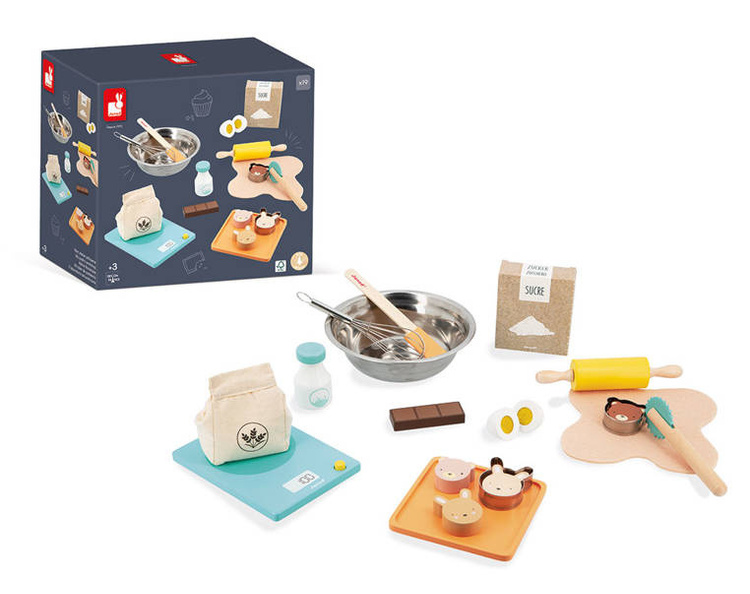 Drewniany zestaw Warsztat cukiernika francuskiej marki JANOD składa się z 19 elementów i sprawi mnóstwo radości każdemu dziecku. Pozwoli mu bezpiecznie uczestniczyć razem z rodzicem w codziennych kuchennych czynnościach i rozwijać pasję gotowania. W skład zestawu wchodzą: mąka w lnianym woreczku, karton cukru, butelka mleka, jajko (2 części z żółtkiem-rzepem do ich łączenia), pasek czekolady, rozwałkowane ciasto, 4 ciasteczka (2 misie i 2 zajączki), drewniana waga kuchenna, metalowa miska i rózga do wyrabiania ciasta, szpatułka, wałek, wykrawaczka, tacka do serwowania. Większość elementów wykonana została z drewna FSC (pozyskanego z lasów zarządzanych w zrównoważony sposób) i pomalowana bezpiecznymi dla dzieci farbami. Stanowią świetne uzupełnienie każdej dziecięcej kuchni.