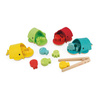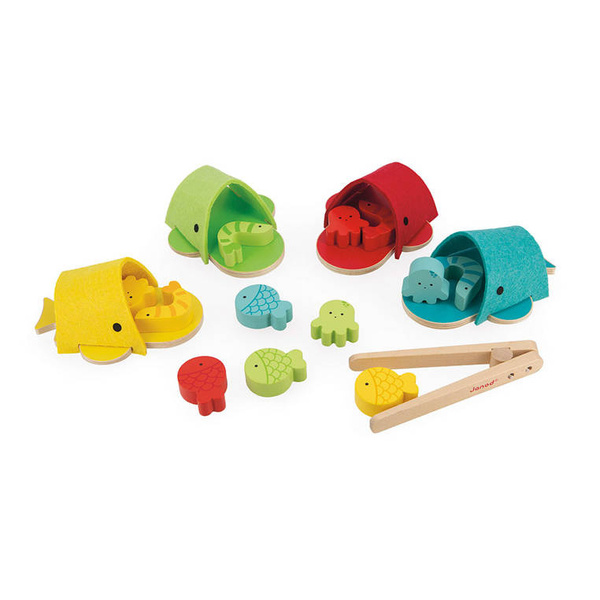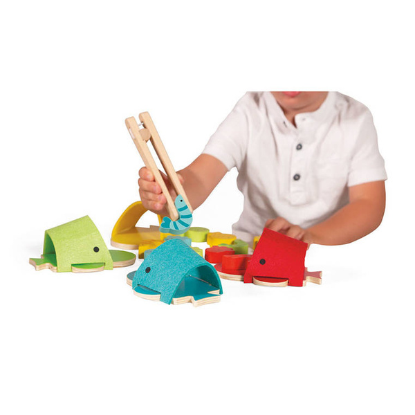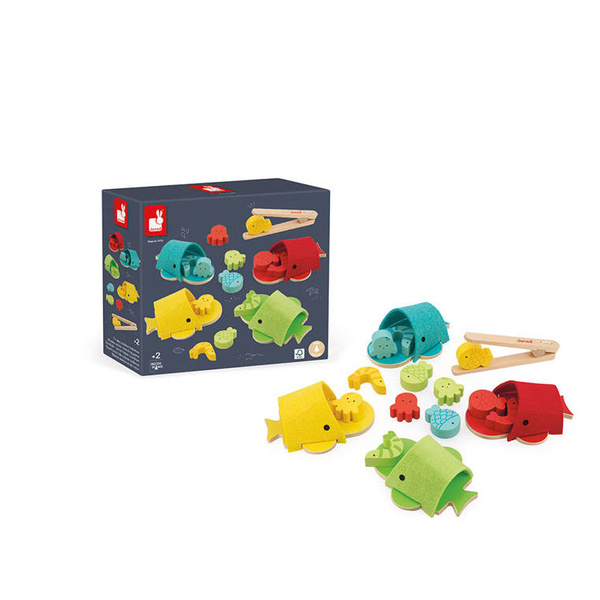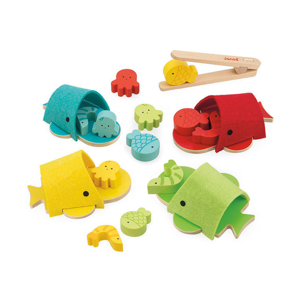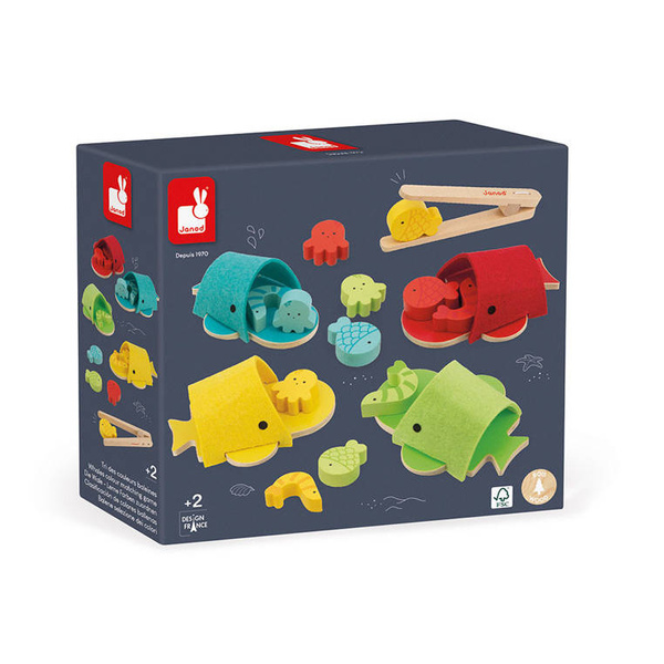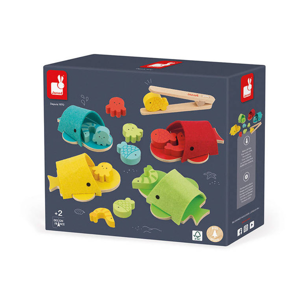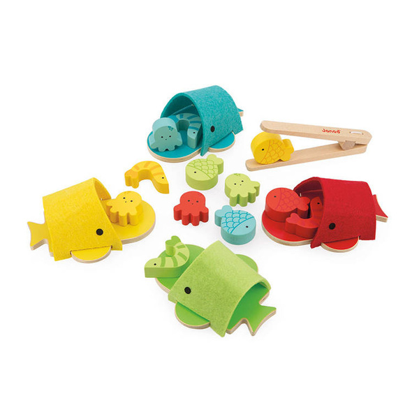 Gra w dopasowywanie kolorów Wieloryby francuskiej marki JANOD to kreatywna zabawka dla kilkulatka, który uczy się rozróżniać i dopasowywać kolory i kształty oraz trenuje chwyt i tzw. małą motorykę. Zestaw składa się z 4 wielorybów z drewnianymi brzuchami i filcowymi grzbietami w kolorach: turkusowym, czerwonym, jasnozielonym i żółtym oraz 12 morskich stworzeń: krewetek, ośmiornic i rybek (po 3 w każdym z tych kolorów), którymi należy owe wieloryby nakarmić. Do kompletu dołączone są też drewniane szczypce do chwytania owych stworzonek i umieszczania ich w paszczy odpowiadającego im kolorem wieloryba – na zasadzie sortera.