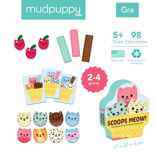 Gra Kocie kulki Miau! amerykańskiej marki MUDPUPPY składa się z 24 kart ze skomponowanymi deserami lodowymi, 32 kolorowych żetonów-kulek lodów w kształcie uroczych kocich pyszczków, 12 podłużnych żetonów-wafelków oraz 30 żetonów-wisienek (też z kocimi mordkami). Zadaniem graczy jest jak najszybsze odtworzenie z pamięci wylosowanych w swojej kolejce deserów. Za każdy dobrze wykonany deser gracz otrzymuje wisienkę. Wygrywa ten, który jako pierwszy zbierze ich 7. Taka gra to wspaniała zabawa zarówno dla dzieci, jak i dorosłych (może w niej brać udział od 2 do 4 osób). Uczy planowania, cierpliwości i skupienia, a przy okazji trenuje pamięć, szybkość reakcji i spostrzegawczość. Do gry dołączona jest instrukcja.