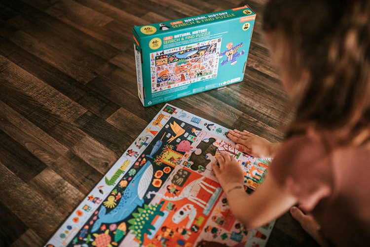 Puzzle obserwacyjne Muzeum historii naturalnej amerykańskiej marki MUDPUPPY nadają układaniu nowy wymiar – na samym złożeniu obrazka zabawa się bowiem nie kończy. Układanka o wymiarach 59 x 39 cm składa się z 64 elementów. Po ułożeniu przedstawia salę w muzeum historii naturalnej, z eksponatami przyrodniczymi na stanowiskach i w gablotach oraz tłumy zwiedzających wystawę osób. To jednak nie wszystko! Na kontrastowym pasku wokół ilustracji znajduje się ponad 40 różnych elementów, które należy odszukać na obrazku, m.in. ryby, żółw, dinozaur, wulkan, rozgwiazda, pani w białym kitlu, dziewczynka z zeszytem czy dziewczynka na wózku inwalidzkim, co dodatkowo uatrakcyjnia układanie i trenuje spostrzegawczość. Wyjątkowy design i przyjazne barwy dodatkowo zachęcają do zabawy. Zapakowane są w estetyczne pudełko. Idealnie nadają się na prezent.