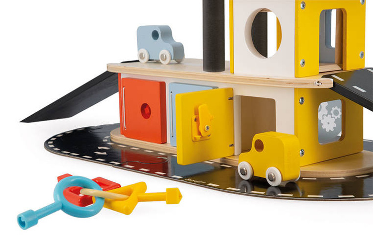 Drewniany piętrowy garaż z serii Bolid francuskiej marki JANOD to idealny prezent dla każdego dziecka. Komplet składa się z kilkupoziomowego (3 kondygnacje!) garażu wraz z akcesoriami: 3 autami i helikopterem. Na najniższym piętrze znajdują się trzy boxy, otwierane dołączonymi do zestawu plastikowymi kluczykami o różnych kształtach geometrycznych (funkcja sortera). Budynek posiada dwa podjazdy, mechaniczną windę (na koło zębate) oraz lądowisko dla helikopterów. Zestaw pozwala na tworzenie wielu scenariuszy zabaw.