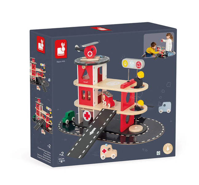 Drewniana remiza z serii Bolid francuskiej marki JANOD to idealny prezent dla każdego dziecka. Komplet składa się z kilkupoziomowej (3 kondygnacje!) remizy wraz z akcesoriami: 2 autami, wozem strażackim, karetką i helikopterem. Budynek posiada dwa podjazdy, mechaniczną windę (na koło zębate) oraz lądowisko dla helikopterów. Na łączącej piętra rurze znajdują się dwie figurki strażaków (niezdejmowane), które puszczone z góry zsuwają się w dół ruchem obrotowym. Zestaw pozwala na tworzenie wielu scenariuszy zabaw.
