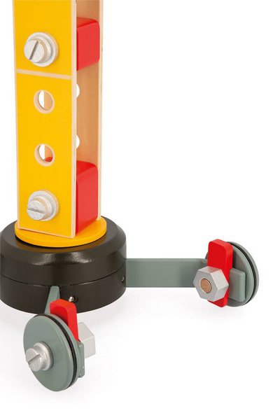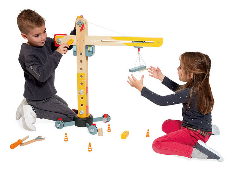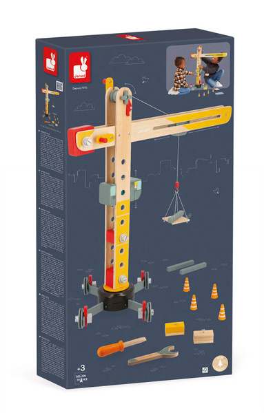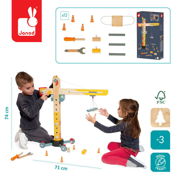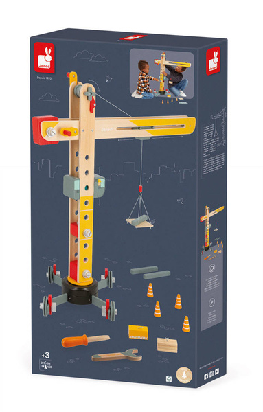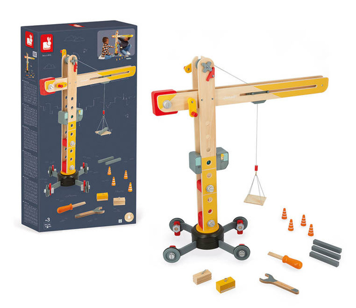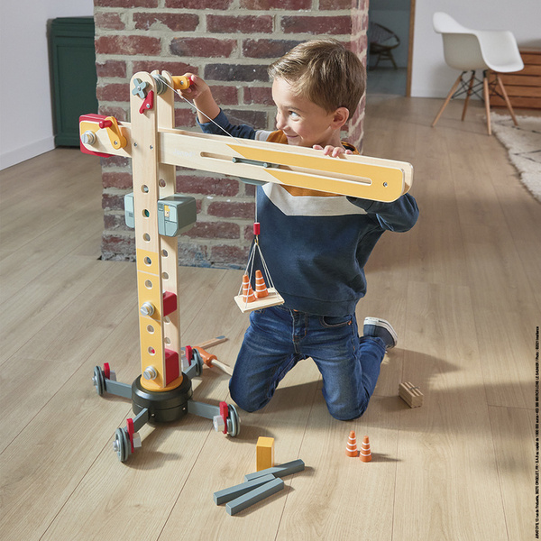 Duży drewniany dźwig do samodzielnego składania z narzędziami francuskiej marki JANOD to idealny prezent dla małego majsterkowicza. Zestaw składa się z elementów do zbudowania urządzenia, w tym np. śrubek, kółek oraz kilku akcesoriów do zabawy dźwigiem, m.in. belek czy pakunków do przenoszenia, pachołków ostrzegawczych i palety na linach oraz śrubokręta i klucza – narzędzi, niezbędnych przy tworzeniu konstrukcji. Zabawka wspomaga rozwój dziecka na wielu płaszczyznach: rozwija zdolności manualne, precyzję ruchów, cierpliwość, koncentrację, stymuluje wyobraźnię i zachęca do tworzenia historii oraz odgrywania sytuacji, znanych z obserwacji dorosłych. Gotowy dźwig ma aż 74 cm wysokości i kółka wykończone są gumą, dzięki czemu nie rysują one podłogi w domu.