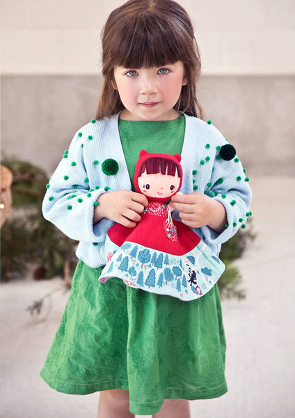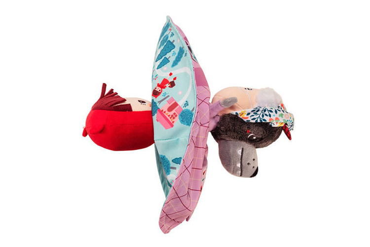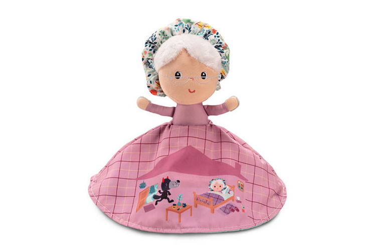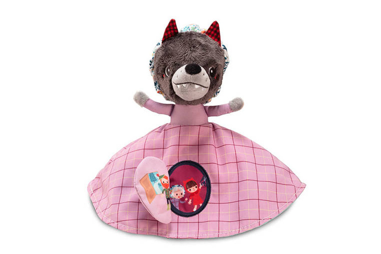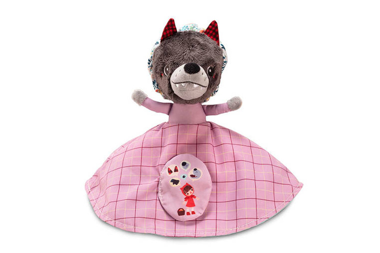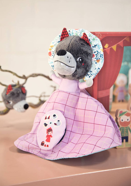 Wielostronna pacynka z kolekcji Czerwony Kapturek belgijskiej marki Lilliputiens jest doskonała do snucia opowieści, czytania czy uspokajania. Miękką laleczkę można przekręcać na kolejne strony, dzięki czemu zmienia się ona w każdą z postaci z popularnej bajki: babcię, wilka oraz Czerwonego Kapturka. Trzymając ją od spodu za ukrytą pod spódniczką główkę można poruszać i „ożywiać” wybranego bohatera. Czerwony Kapturek ma grzywkę, kieszonkę-torebkę, a dół jego spódnicy zdobi droga przez las. Po obróceniu zamienia się w Babcię w różowej kraciastej sukience, z okularami, białymi włosami i czepkiem w kwiatki. Dół babcinej spódnicy zdobi scena spotkania z wilkiem w jej domku. Tył glowy babci stanowi głowa Wilka, ubranego w jej czepek i sukienkę, jej dół zdobi jednak okienko, po otwarciu którego widać scenę uwolnienia Babci i Czerwonego Kapturka przez Gajowego. Pacynka jest perfekcyjnie wykończona, z dbałością o każdy szczegół i w pełni bezpieczna dla dziecka. Zaskakuje i pobudza dziecięcą wyobraźnię, zachęca do tworzenia historii, rozwija małą motorykę, zmysł dotyku, oswaja również dziecko z zasadami społecznych zachowań.