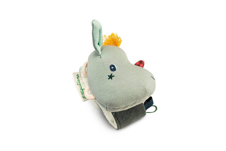 Pluszowa grzechotka na zwijanej bransoletce Smok Joe belgijskiej marki Lilliputiens to niebanalna aktywizująca zabawka dla niemowląt. Miękka, kolorowa, uszyta z bawełny, bransoletka jest zapinana na rzep i można ją założyć na rączkę lub nóżkę maluszka. Szeleści przy pocieraniu. Zdobi ją główka – grzechotka zielonego Smoka Joe ze stymulującymi sensorycznie uszami, sznurkowymi wypustkami, tasiemkami, fryzurą i rogiem na nosie. Zabawka rozwija małą motorykę (potrząsanie), aktywizuje zmysł słuchu (szeleści, grzechocze), wzroku i dotyku. Grzechotka wykonana została z jersey'u i elanobawełny organicznej oraz wypełniona poliestrem z recyklingu.