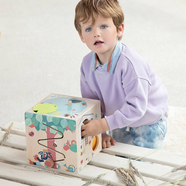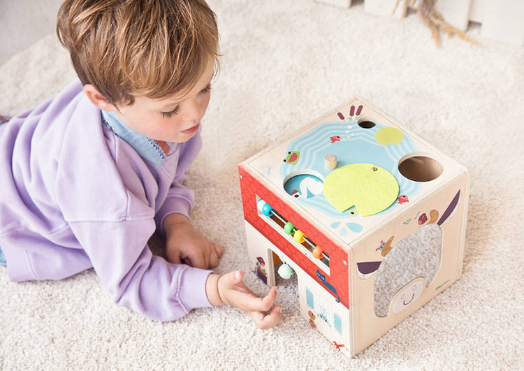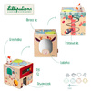Drewniana kostka aktywizująca Farma belgijskiej marki Lilliputiens to niebanalne wielofunkcyjne źródło rozrywki i nauki dla ciekawskich maluszków. Kostka ma otwarty dół, a na każdej z pozostałych 5 ścian znajdują się różne rodzaje zabaw i funkcji: