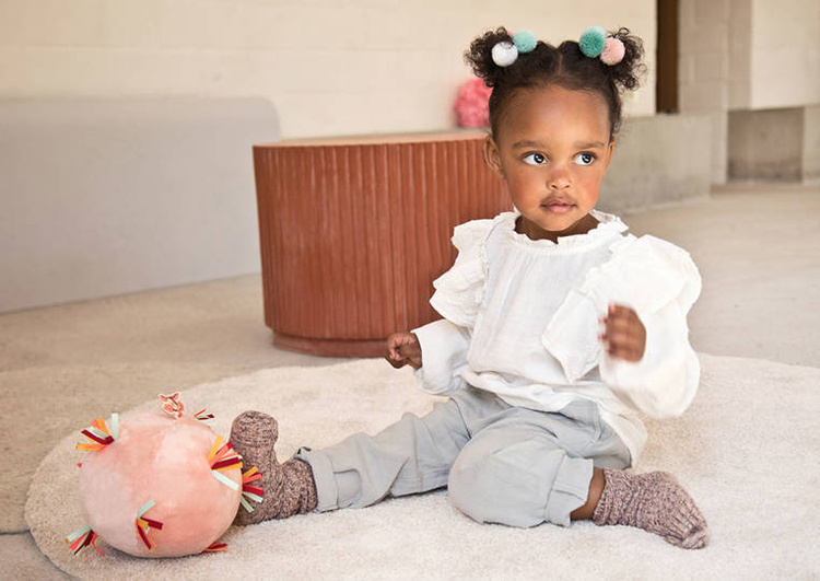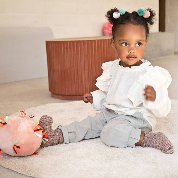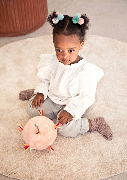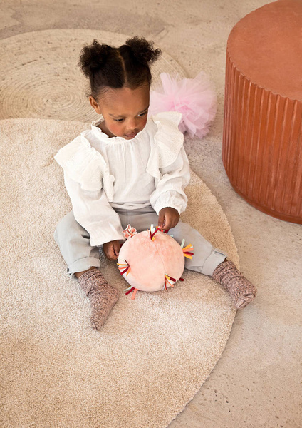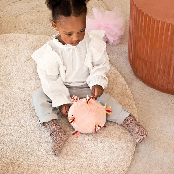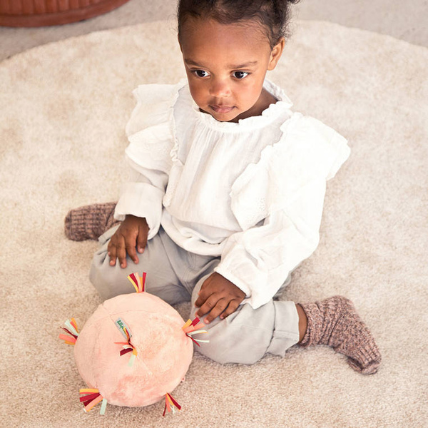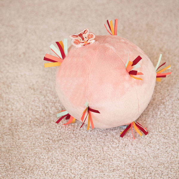 Piłeczka dźwiękowa z kolekcji Sarenka Stella belgijskiej marki Lilliputiens to miękka aktywizująca zabawka dla niemowląt. Piłka jest wykonana z jasnoróżowego futerka, ma wiele stymulujących sensorycznie wypustek z kolorowych wstążeczek i metkę z Sarenką Stellą, a także ukrytą wewnątrz pozytywkę (uruchamianą przyciskiem) z 7 różnymi dźwiękami, m.in. trąbki czy marakasów. Jest poręczna i całkowicie bezpieczna. Odpowiada na potrzebę turlania i rzucania przedmiotów, co jest naturalnym etapem rozwoju maluszka, a przy okazji rozwija małą motorykę (chwyt, potrząsanie), aktywizuje zmysł dotyku i słuchu (gra).