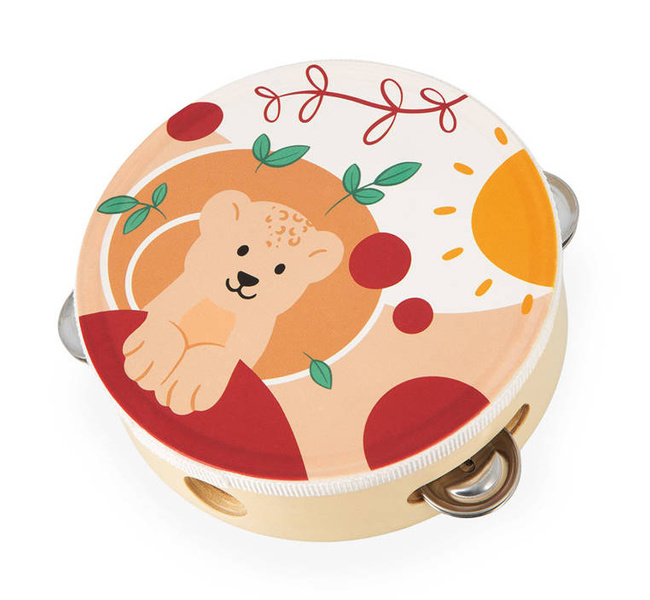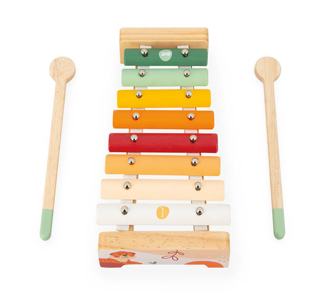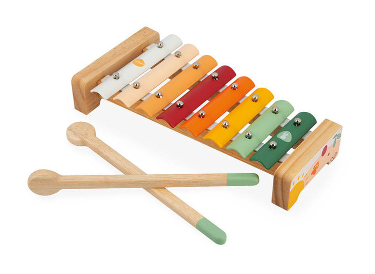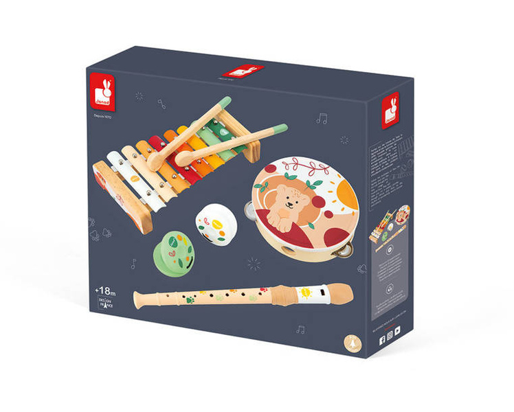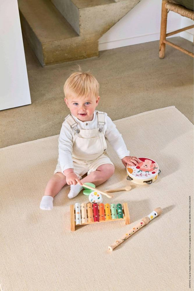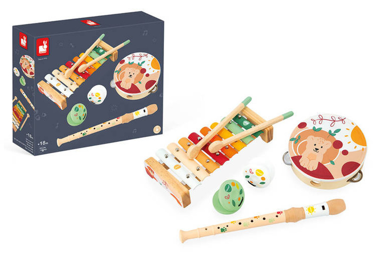 Zestaw zabawek muzycznych z serii Sunshine francuskiej marki JANOD to idealna pierwsza zabawka muzyczna dla dziecka, która pomaga rozwijać słuch, poczucie rytmu oraz zdolności muzyczne. Wspiera także rozwój wyobraźni, koncentracji, wytrwałości i koordynacji ruchowej. W skład zestawu wchodzą: ksylofon z ośmioma metalowymi klawiszami (8 tonów) i drewnianymi pałeczkami, kastaniety, flet i tamburyn. Każdy instrument brzmi inaczej, dzięki czemu dziecko będzie miało możliwość poznania wielu dźwięków, a także – dzięki ilości elementów – stworzenia z przyjaciółmi własnego zespołu. Zestaw wyróżnia piękna słoneczna kolorystyka – na tamburynie namalowany jest mały lewek Leo, flet zdobią odciski łap, a kastaniety – barwne motywy roślinne.