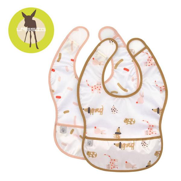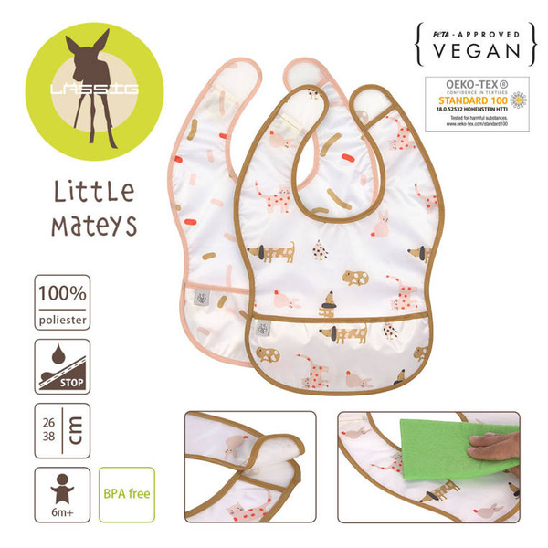 Zestaw dwóch praktycznych, łatwo zmywalnych śliniaków niemieckiej marki LASSIG. Są duże, transparentne, wykonane z wodoodpornego tworzywa – jeden biały z jasnokoralowym obszyciem i kolorowym wzorem, imitującym karmę domowych zwierzątek, drugi także biały z karmelowym obszyciem i printem z tymi stworzeniami: łaciatym jamnikiem, kotem w pomarańczowe plamki, świnką morską w ciapki, nakrapianym gołębiem oraz królikiem z pomarańczowym ogonkiem. Miękka taśma i zapięcie na rzep zapewniają komfort użytkowania. Śliniaki przeznaczone są dla dzieci od 6. do 24. miesiąca życia. Sprawdzą się przy płynnych czy szczególnie brudzących posiłkach, przy karmieniu, jak i pierwszych próbach samodzielnego jedzenia. Na dole mają kieszonkę, gdzie mogą się zbierać resztki pokarmu, które nie trafiły do buzi. Dzięki temu masz pewność, że nie zaplamią ubrania maluszka. Śliniaki stanowią część większej kolekcji Little Mateys. Możesz dobrać do nich inny produkt w tej samej gamie kolorystycznej.