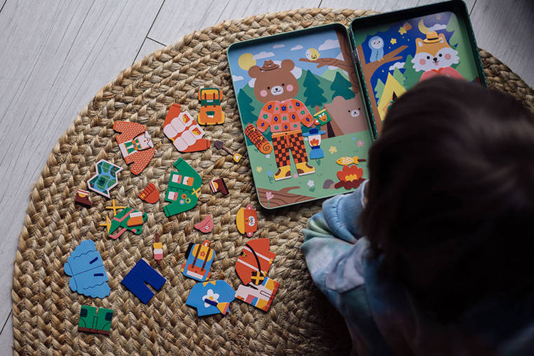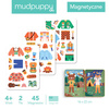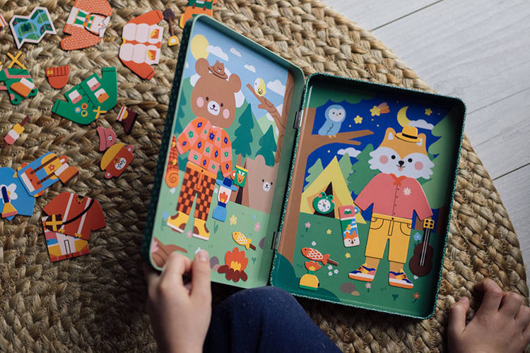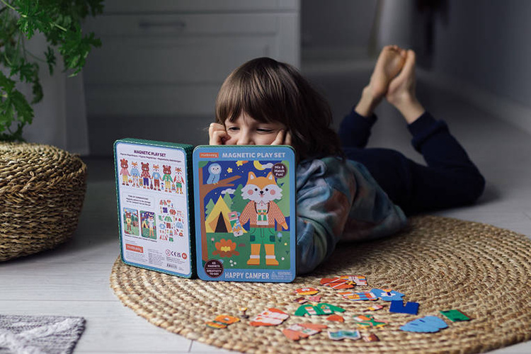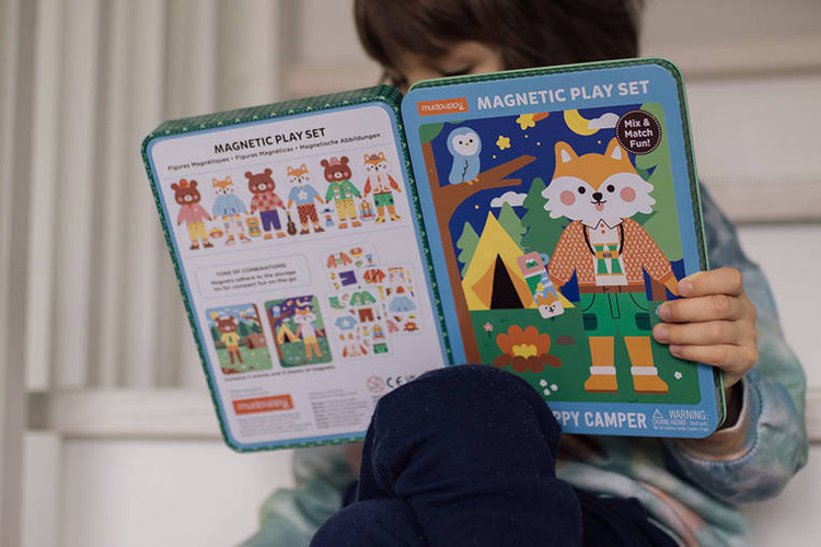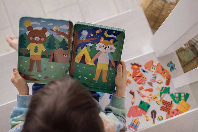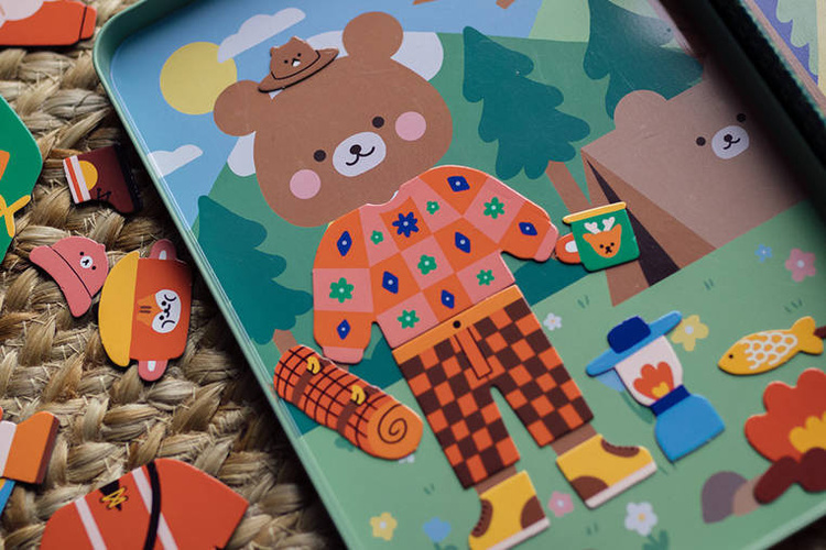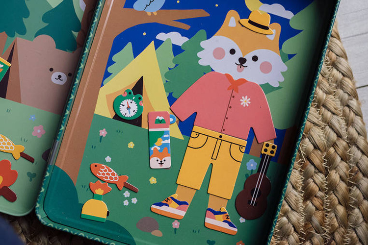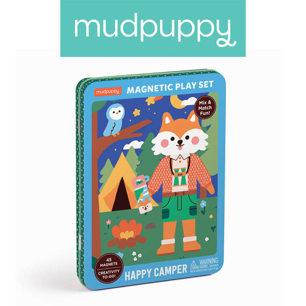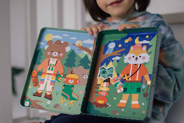 Zestaw magnesów do tworzenia postaci Wesoły biwak amerykańskiej marki MUDPUPPY to wyjątkowo kreatywna zabawka dla dzieci od 4. roku życia. Na dwóch magnetycznych kartach znajdują się tła, przedstawiające leśne pola namiotowe (za dnia i w nocy). Można umieszczać na nich magnesy (ponad 45), tworząc różnorodne turystyczne stylizacje dla dwóch postaci: liska i niedźwiadka. Do wyboru są elementy ich strojów, nakrycia głowy, buty, plecaki, sprzęt biwakowy i inne elementy.