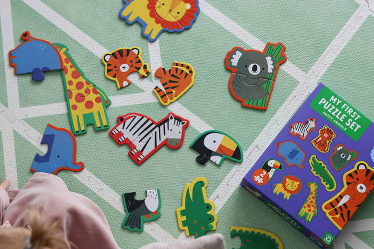 Pierwsze puzzle Szczęśliwe zwierzątka amerykańskiej marki MUDPUPPY to zestaw 8 układanek dla dzieci od 2. roku życia. Wszystkie one liczą sobie po 2 elementy, dzięki czemu dzieci mogą łatwo i szybko oswoić się z tą formą zabawy. Każdy obrazek-zwierzątko ma rozmiar ok. 10x15 cm, jest zatem poręczny dla malucha. W zestawie znajdują się: lew, koala, zebra, słoń, żyrafa, tygrys, krokodyl i tukan. Ułożone stworzenia można wykorzystywać do snucia opowieści o przygodach w tropikach. Piękne kolory i sympatyczne miny zwierzaków dodatkowo zachęcają do zabawy.
