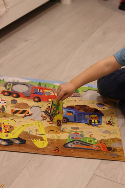 Zestaw puzzli podłogowych Plac budowy amerykańskiej marki MUDPUPPY składa się z 25 bardzo dużych, łatwych do układania elementów, w tym 6 elementów specjalnych w unikatowych kształtach, a są to: wózek widłowy prowadzony przez aligatora, spychacz prowadzony przez słonia, zając z młotem pneumatycznym, tygrys ze szpadlem, niedźwiedź z łopatą oraz znak drogowy z grafiką betoniarki. Ułożony z nich sporych rozmiarów (56 x 56 cm) obrazek przedstawia tętniący życiem plac budowy. Układankę można wykorzystywać do snucia opowieści o procesie budowania i zapoznania dziecka z różnymi zawodami i pojazdami specjalnymi. Wyjątkowy pomysł, design i przyjazne barwy dodatkowo zachęcają do zabawy.