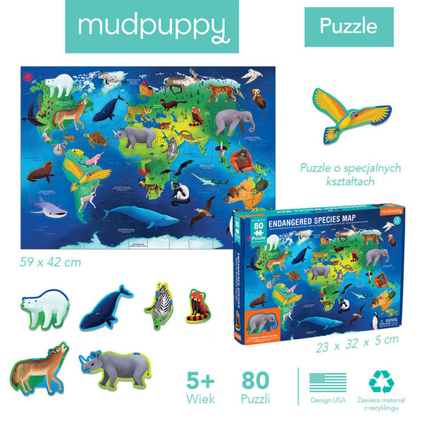 Puzzle edukacyjne Zagrożone gatunki amerykańskiej marki MUDPUPPY to układanka z 80 elementów, z których 17 ma kształt objętych ochroną zwierząt; do umiejscowienia w rejonach, w których występują. Ułożenie całej mapy świata (59 x 42 cm) pomaga dziecku poznać wszystkie kontynenty i przyporządkować do nich odpowiednie gatunki zagrożonych wyginięciem stworzeń (niektóre są już naniesione na mapę), m.in. niedźwiedzia polarnego, pandkę rudą, czarno-białego wari czy pingwina białobrewego. Do zestawu dołączony jest plakat z ich nazwami i lokalizacją. Wyjątkowy design i przyjazne barwy dodatkowo zachęcają dziecko do zabawy. Puzzle zapakowane są w estetyczne pudełko. Idealnie nadają się na prezent.