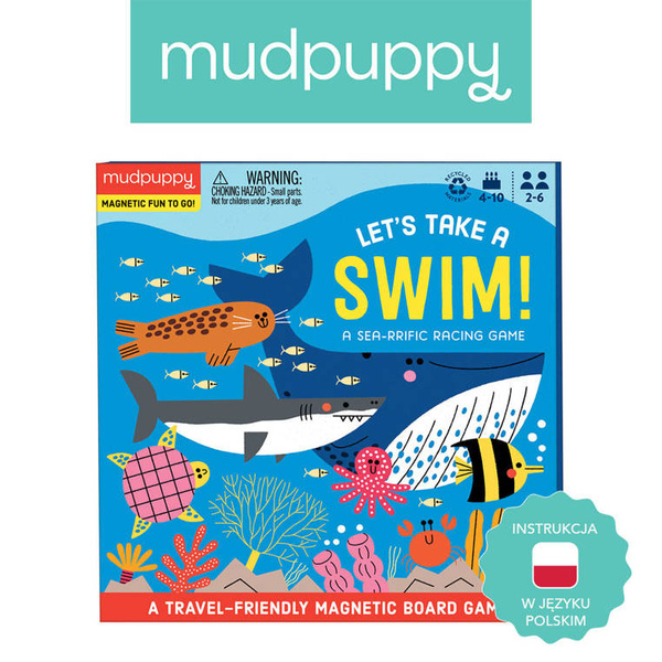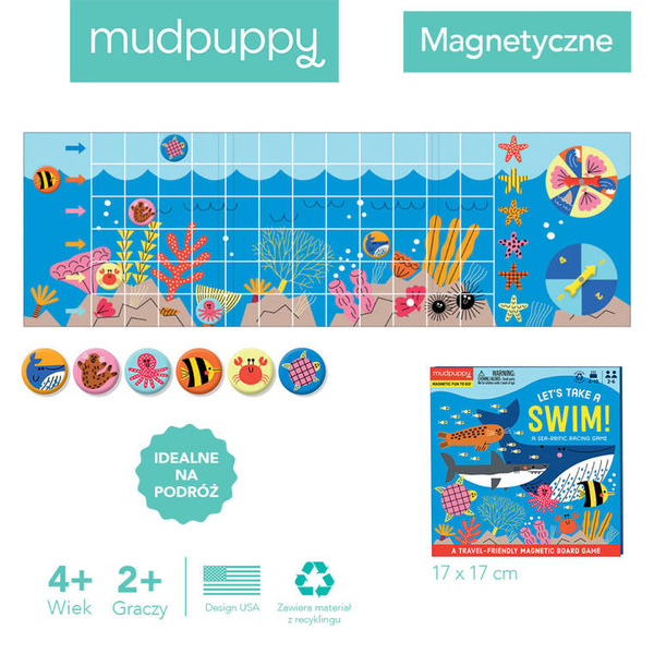 Magnetyczna gra planszowa typu wyścig Zawody pływackie amerykańskiej marki MUDPUPPY składa się z podłużnej planszy z grafiką podwodnego świata i sześcioma torami (po 12 pól każdy), dwoma strzałkami do obracania oraz 6 magnetycznych żetonów-postaci: wieloryba, foki, rybki, ośmiornicy, kraba i żółwia. Zadaniem graczy jest jak najszybsze dotarcie do mety swoim pionkiem. W swojej kolejce każdy z graczy kręci obiema strzałkami i wykonuje zadania, zgodnie z polami, na których się ona zatrzyma. To wspaniała zabawa zarówno dla dzieci, jak i dorosłych (może w niej brać od 2 do 6 osób). Do gry dołączona jest instrukcja (również w języku polskim).