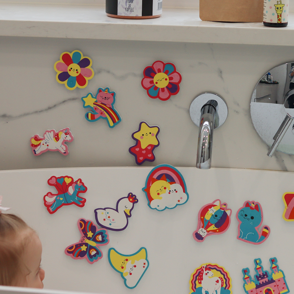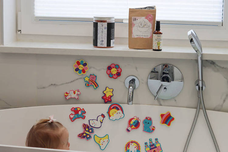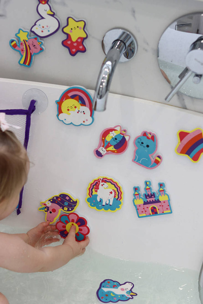 Piankowe figurki do kąpieli Marzenia jednorożca amerykańskiej marki MUDPUPPY są wykonane z miękkiego, łatwego do czyszczenia i szybkoschnącego materiału. Oprócz jednorożców wśród 20 oryginalnych kształtów znajdują się także m.in. kwiaty, gwiazdki, księżyc, zamek, motyl, kotek w balonie czy kotorożec z kometą. Figurki po zanurzeniu w wodzie zyskują „magiczne” właściwości i dają się przyklejać do wanny lub płytek w łazience. Zabawka zachwyca i rozbudza wyobraźnię, pozwala na tworzenie wielu ciekawych historii lub odgrywanie teatrzyków. Autorką wzorów jest francuska artystka i autorka książek Clémentine Dérodit. Zabawka zapakowana jest w estetyczną, szybkoschnącą siateczkę mesh z przyssawkami, w której można łatwo przechowywać jej elementy. Idealnie nadaje się na prezent. Stanowi doskonałe uzupełnienie magicznej książeczki do kąpieli Marzenia i jednorożce, przeznaczone dla starszych dzieci.