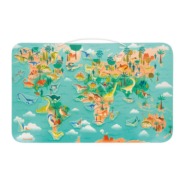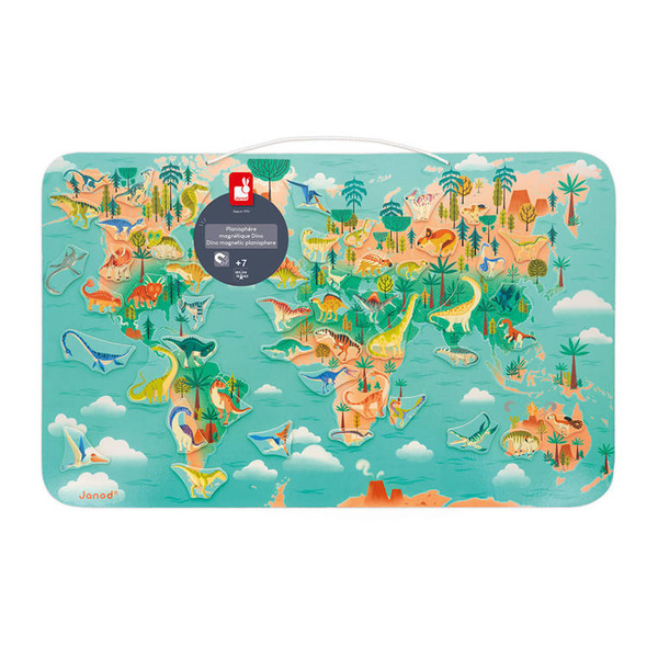 Magnetyczna układanka mapa świata z kolekcji Dinozaury francuskiej marki JANOD to doskonała zabawka, rozwijająca kreatywność i wyobraźnię. Zabawa polega na układaniu magnesów na dużej drewnianej planszy z piękną grafiką prehistorycznej mapy świata, utrzymanej w barwach kolekcji, tj. odcieniach pomarańczu i turkusu. W zestawie jest aż 50 magnesów, przedstawiających różne gatunki dinozaurów, które należy umieszczać na mapie, zgodnie z rejonem ich występowania. Układanka ta będzie służyć dziecku przed bardzo długi czas i nieprędko się znudzi. Jest doskonale wykonana, co dodatkowo rozbudza zmysł estetyczny, a ponadto ćwiczy sprawność manualną dziecka. To także świetny sposób na naukę paleontologii. Planszę można zawiesić na sznurku. Zabawka została zaprojektowana we Francji. Idealnie nadaje się na prezent.