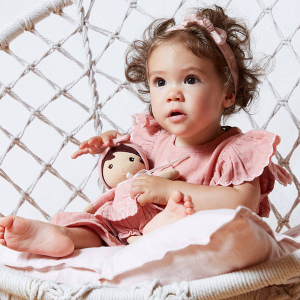 Urocza lalka-przytulanka Amandine francuskiej marki KALOO to idealna pierwsza przyjaciółka Twojego maluszka. Jest niezwykle miękka, piękna, perfekcyjnie wykończona i przede wszystkim całkowicie bezpieczna dla dziecka już od pierwszych dni jego życia. Ma słodką minkę, urocze, duże brązowe oczy, stylową ciemnobrązową fryzurkę i beżowy odcień skóry (ma przypominać skórę dziecka, spędzającego dużo czasu na świeżym powietrzu). Jej śliczna różowa tunika i szorty oraz opaska z kokardką na głowie wykonane zostały z przyjemnego w dotyku muślinu. Na wstążce pod szyjką lalki znajdziesz miejsce na imię Twojego dziecka, by uczynić tę maskotkę jeszcze bardziej wyjątkową. Na nóżkach przytulanka ma jasnoróżowe buciki z haftowanymi guziczkami. Jest poręczna – ma 25 cm – dla małych rączek. Stworzona do tulenia, usypiania, uspokajania, zabierania na spacery i na dłuższe wyprawy.
