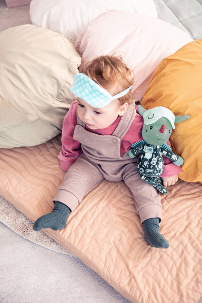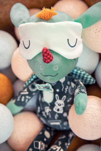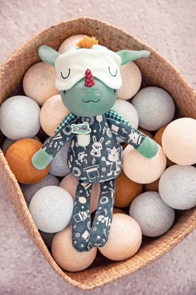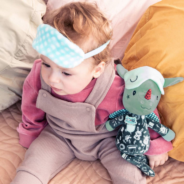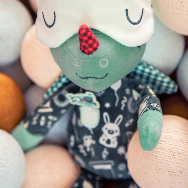 Przytulanka do spania Smok Joe belgijskiej marki Lilliputiens to wspaniały pierwszy przyjaciel maluszka. Jest idealny do tulenia, uspokajania i usypiania. Ma postać zielonego smoka o imieniu Joe, 32 cm wysokości i ciemną piżamkę z kieszonką (i sówką-naszywką, która dodatkowo stymuluje sensorycznie) oraz z fluorescencyjnymi grafikami, które świecą w ciemności. Joe ma kraciaste skrzydełka, odstające uszy, żółtą czuprynkę i czerwony róg na nosie, a na głowie opaskę, którą można zsuwać na oczy. Opaska ta także świeci po zgaszeniu światła. Przytulanka jest solidnie wykonana i bezpieczny. Aktywizuje zmysł dotyku i wzroku, pomaga w zasypianiu i wyciszaniu się.
