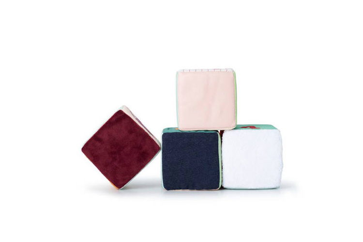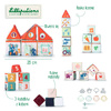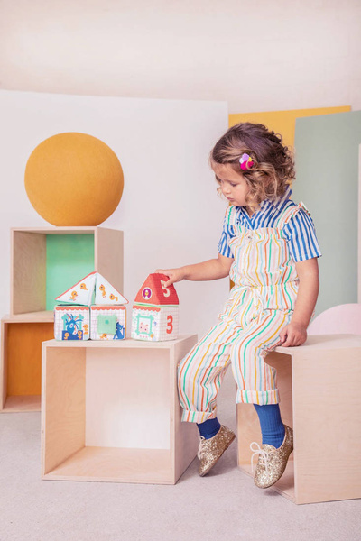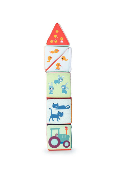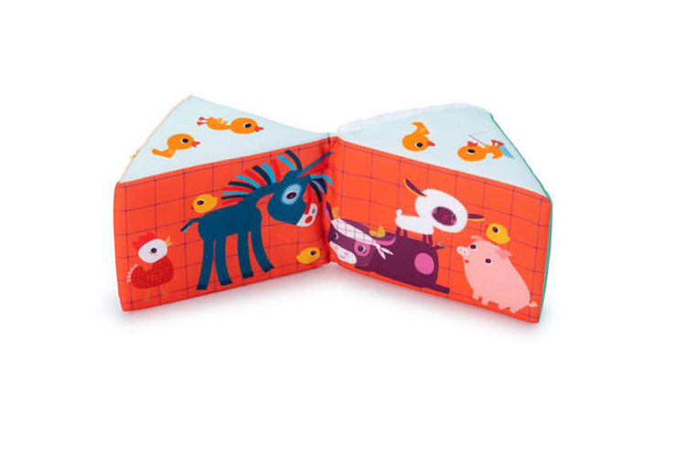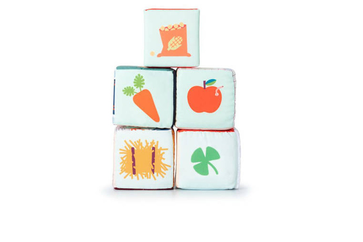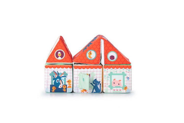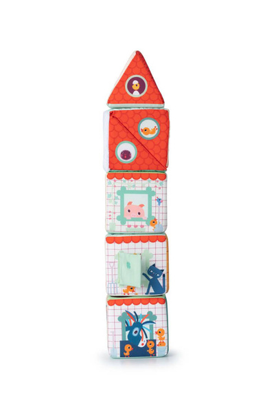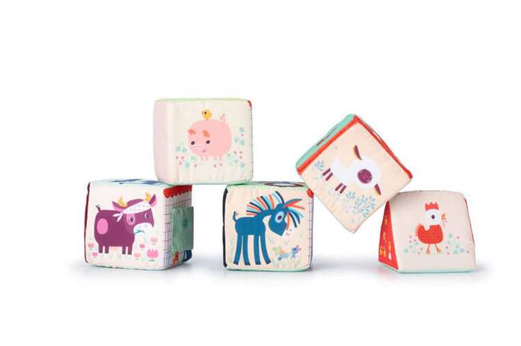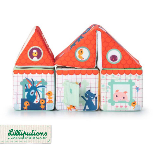 Zestaw 5 miękkich wielofunkcyjnych klocków z kolekcji Farma belgijskiej marki Lilliputiens to niebanalna zabawka dla małych dzieci. Każdy z elementów ma inne ilustracje, a niektóre również ukryte elementy i funkcje. 4 mają kształt sześcianów, z których jeden można rozkładać na pół po przekątnej, ostatni zaś jest graniastosłupem o trójkątnych bokach. Można z nich ułożyć stodołę z czerwonym dachem, okienkami i otwieranymi drzwiami. Na kolejnych bokach znajdują się postacie gospodarskich zwierzątek: kokoszki Paulette, świnki Simona, krówki Rosalie, osiołka Ignace'a oraz owieczki Yvonne. Kolejne boki obszyte zostały tkaninami o różnych fakturach i służą do ćwiczeń sensorycznych, na następnych znajdują się cyfry od 1 do 5, a na jeszcze następnych – elementy w odpowiedniej liczbie, tj. 1 traktor, 2 koty, 3 zajączki, 4 kaczątka i 5 kurczaczków. Na ostatnich bokach znaleźć można ilustracje plonów: siano, marchew, koniczynę, jabłko i kukurydzę. Zestaw rozwija małą motorykę (chwytanie, ustawianie jeden na drugim, obracanie, otwieranie, zamykanie), aktywizuje zmysł wzroku (kolory) i dotyku (materiały o zróżnicowanej fakturze, wystające detale), stanowi świetne wprowadzenie do nauki liczenia i rozpoznawania cyfr (do 5), zaznajamia dziecko z życiem na farmie, zwierzętami i typowymi dla tego miejsca zjawiskami.
