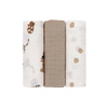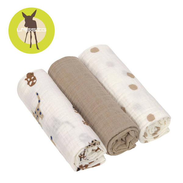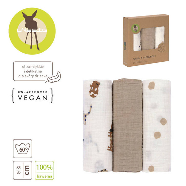 Komplet trzech wielofunkcyjnych bawełnianych pieluszek otulaczy z kolekcji Little Mateys niemieckiej marki LASSIG. Jeden w ciepłym odcieniu melanżowego beżu, drugi kremowy ze wzorem w grochy, a trzeci z grafiką zabawnych domowych pupili: łaciatym jamnikiem, świnką morską w ciapki czy nakrapianym gołębiem (niektóre wzorki na zwierzakach są niebieskie). Kocyki mają spore rozmiary – 85x85 cm – i mogą być używane np. do owijania maluszka, jako pieluszka do odbijania po karmieniu, okrycie podczas letniej drzemki, osłona do wózka, jako prześcieradełko, chusta do karmienia i na wszelkie inne sposoby według potrzeb. Są jednowarstwowe, przewiewne i delikatne dla skóry. Dzięki kompletowi 3 sztuk rodzic ma potrzebny otulacz zawsze pod ręką.