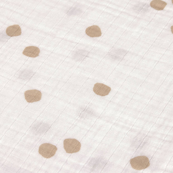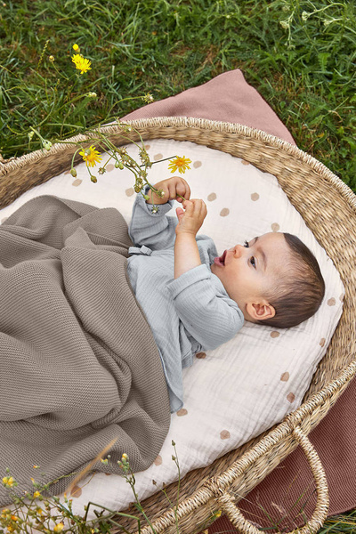 Bawełna muślinowa to jedna z najdelikatniejszych tkanin na świecie, bezpieczna dla skóry niemowląt. Muślin jest oddychający, a jego otwarty splot i lekkość zmniejszają ryzyko przegrzania dziecka, zapewniając jednocześnie komfort. Dodatkowo jest bardzo trwały i ultramiękki.