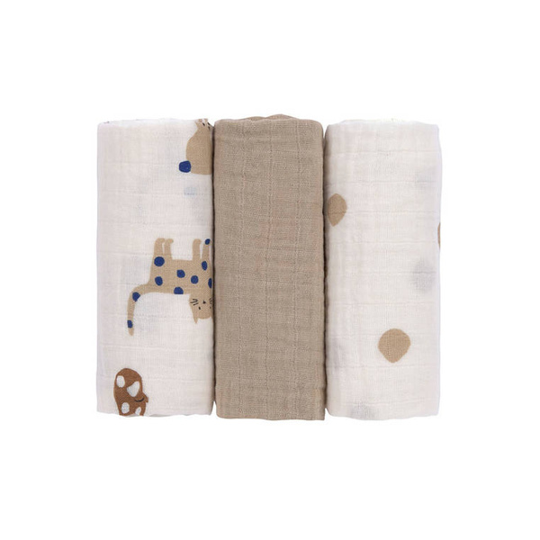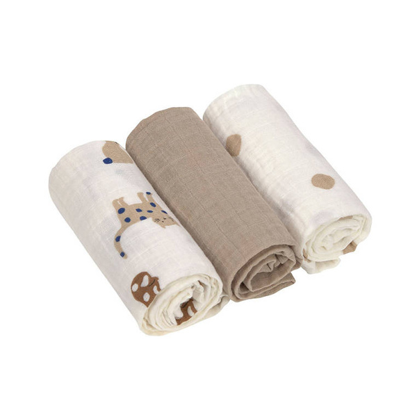Komplet trzech wielofunkcyjnych bawełnianych pieluszek otulaczy z kolekcji Little Mateys niemieckiej marki LASSIG. Jeden w ciepłym odcieniu melanżowego beżu, drugi kremowy ze wzorem w grochy, a trzeci z grafiką zabawnych domowych pupili: łaciatym jamnikiem, świnką morską w ciapki czy nakrapianym gołębiem (niektóre wzorki na zwierzakach są niebieskie). Kocyki mają wygodne rozmiary – 60x60 cm – i mogą być używane np. do owijania maluszka, jako pieluszka do odbijania po karmieniu, okrycie podczas letniej drzemki, osłona do wózka, jako prześcieradełko, chusta do karmienia i na wszelkie inne sposoby według potrzeb. Są jednowarstwowe, przewiewne i delikatne dla skóry. Dzięki kompletowi 3 sztuk rodzic ma potrzebny otulacz zawsze pod ręką.
