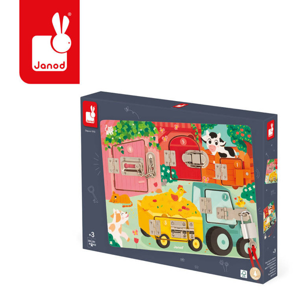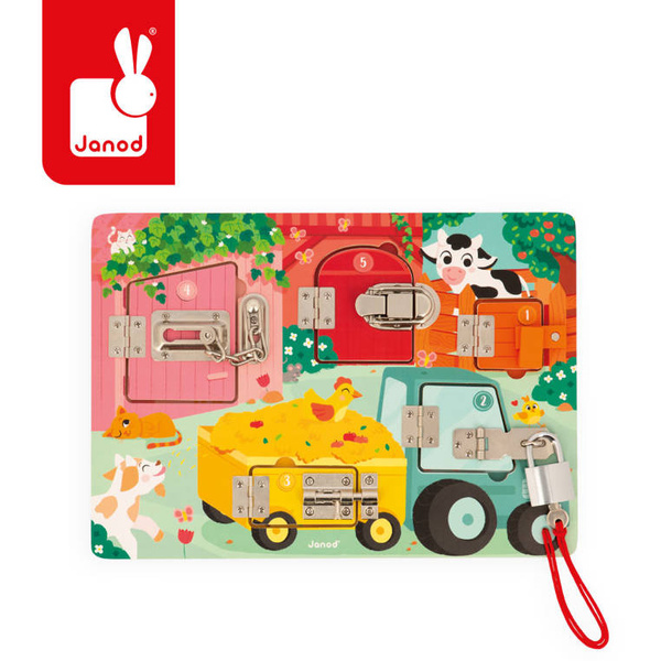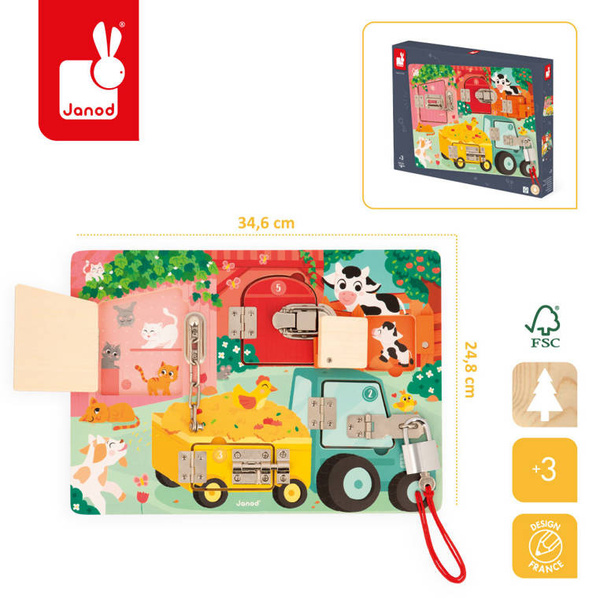 Drewniana tablica manipulacyjna Farma francuskiej marki JANOD to idealna zabawka edukacyjna dla dzieci od 3. roku życia. Zabawka posiada 5 rodzajów zamknięć, z których każde coś otwiera, ujawniając nowych bohaterów gospodarskiej scenki: drewniana zapadka prowadzi do zagrody z krówką, kłódka na kluczyk – do traktora, zasuwka – do naczepy z sianem, pod którym śpią kózki, łańcuch – do kociego domku, a zatrzask – do kurnika. Zabawka jest solidnie wykonana i w pełni bezpieczna dla dziecka. Stanowi doskonały trening małej motoryki i pomaga trenować chwyt, sprawność palców i zdolności manipulacyjne, a także zrozumieć zależności przyczynowo-skutkowe (zamykanie-otwieranie).