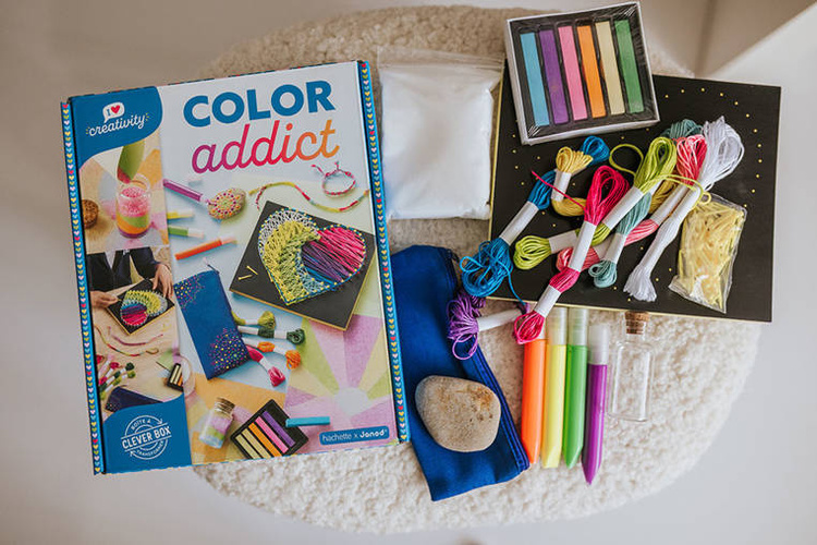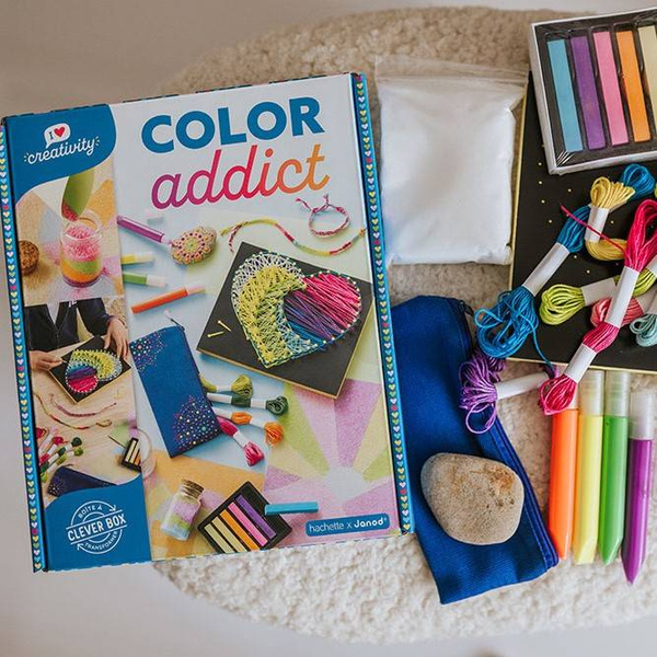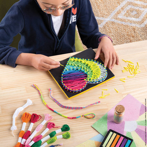 Multizestaw kreatywny Kolory z serii I love creativity francuskiej marki JANOD zawiera 8 różnorodnych projektów do wykonania – dwa obrazki do namalowania piaskiem, jeden obrazek-przeplatanka, piórnik i kamień do pomalowania kropkami, buteleczka z piaskiem oraz dwie sznurkowe bransoletki do uplecenia. W zestawie znajdują się wszystkie niezbędne elementy do stworzenia prac oraz instrukcja, ułatwiająca zadanie. Ponadto sprytne opakowanie zestawu może stać się ramką 3D dla skończonego obrazka. Tworzenie różnymi technikami to dla dziecka długie godziny angażującej i jednocześnie uspokajającej, wyciszającej zabawy, a gotowe dzieła zapewnią emocjonującą rozrywkę dla kilkorga dzieci, a nawet dla dorosłych. Zestaw zaprojektowano we Francji. Idealnie nadaje się na prezent.