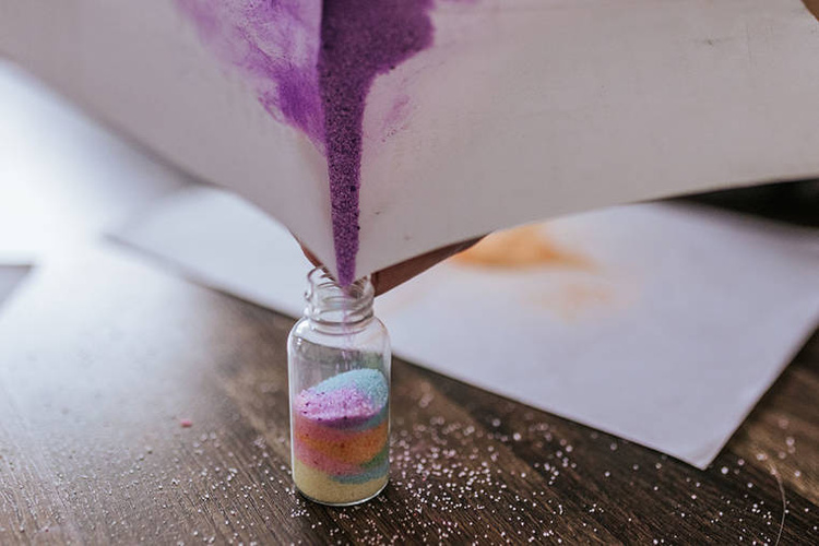 materiał: karton, farby, tkanina, sznurki, szkło, piasek, kamień