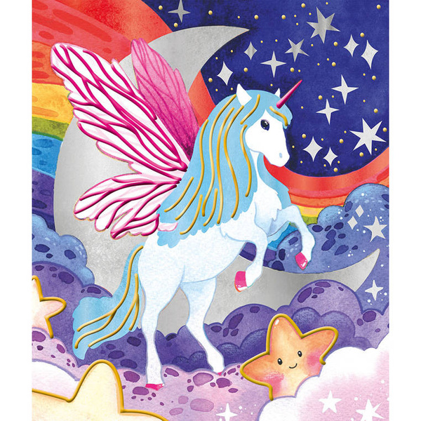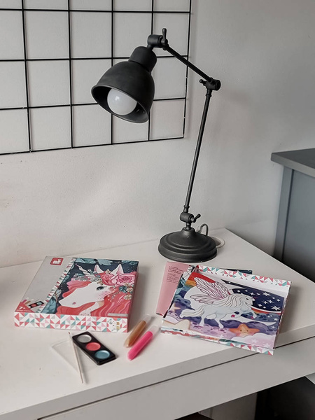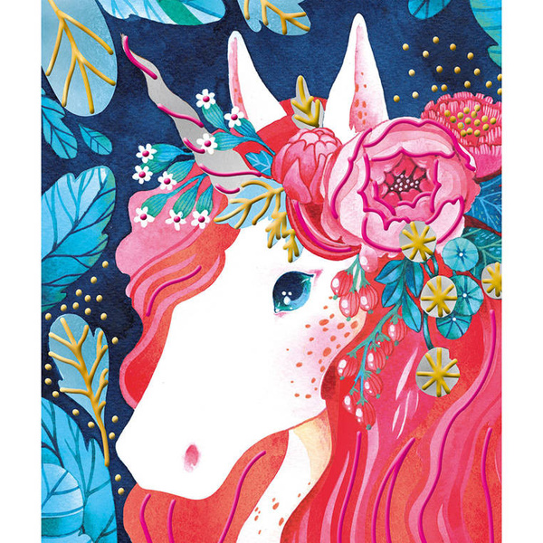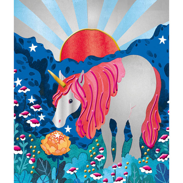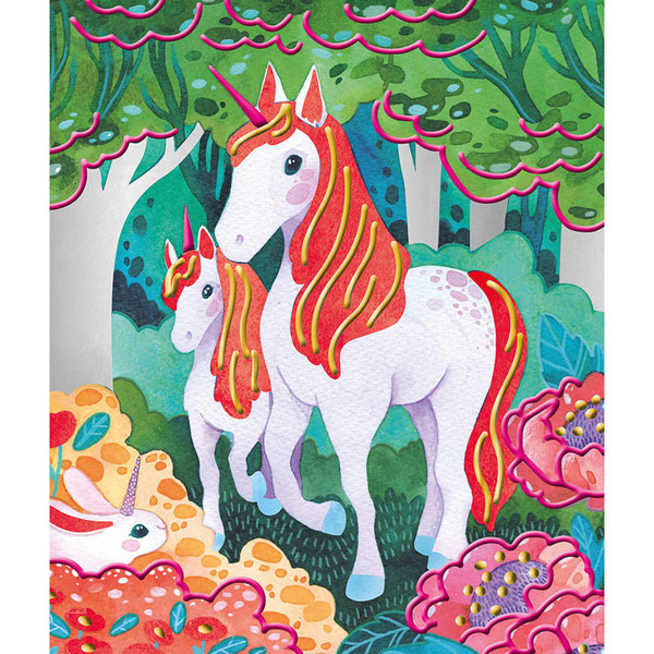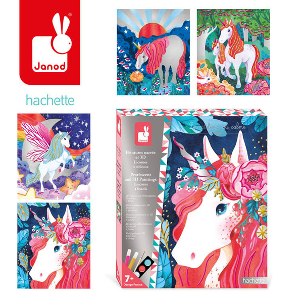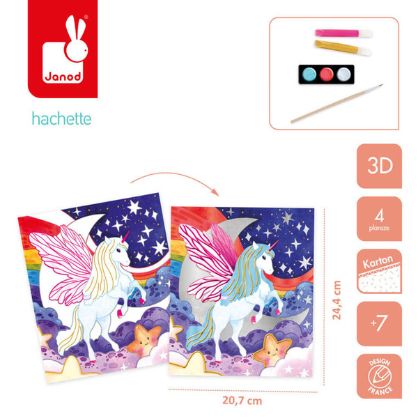 Zestaw kreatywny Malowanie perłowymi i farbami 3D Dżungla francuskiej marki JANOD zawiera 4 plansze-obrazki z barwnymi baśniowymi sceneriami, których bohaterami są piękne jednorożce. Ilustracje należy ozdobić za pomocą dołączonych do zestawu farb perłowych (paleta 3 kolorów), nadających satynowy połysk oraz dwóch farb do malowania 3D, tj. ze strukturą. Farby – fuksjowa i złota – znajdują się w tubkach ze specjalnymi końcówkami, umożliwiającymi nakładanie ich w pożądany sposób. Do nakładania farb perłowych służy załączony pędzelek. W komplecie znajduje się także instrukcja, która ułatwi wykonanie zadania. Różne techniki malowania to dla dziecka długie godziny angażującej i jednocześnie uspokajającej, wyciszającej zabawy, a gotowe obrazki staną się wspaniałym elementem dekoracyjnym dziecięcego pokoju.