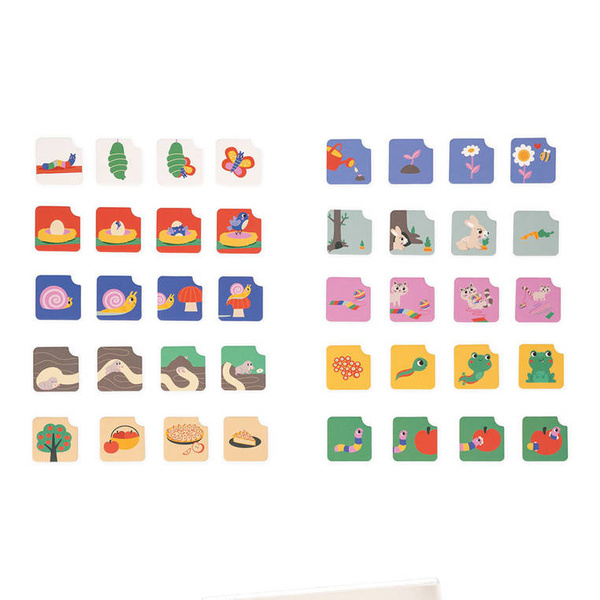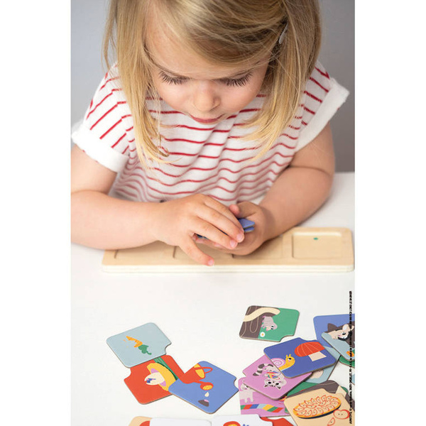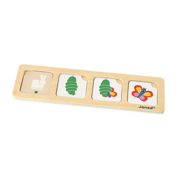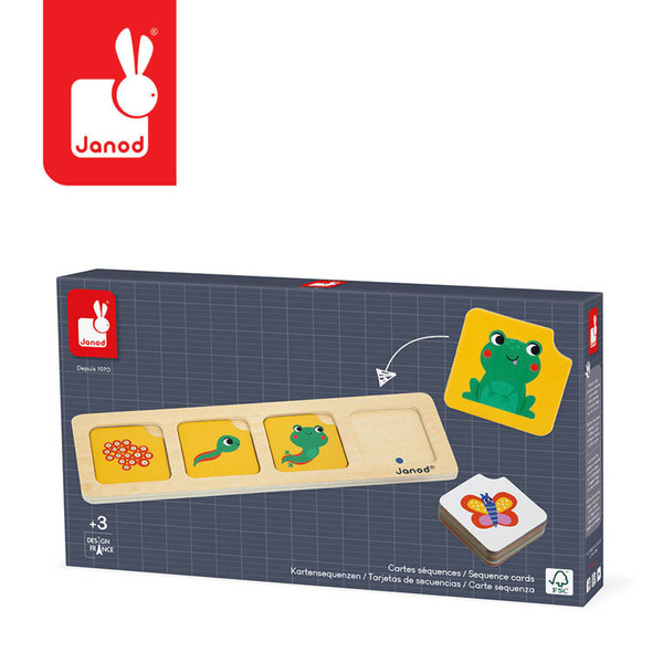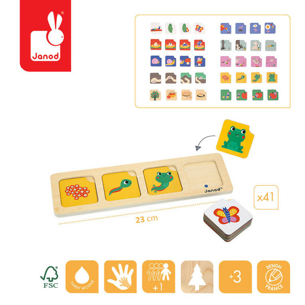 Karty sekwencji Ogród francuskiej marki JANOD to idealna zabawka edukacyjna dla dzieci od 3. roku życia. Pomoże ona maluchom zrozumieć zależności przyczynowo-skutkowe różnych zdarzeń i procesów, zachodzących w przyrodzie. Zestaw składa się z drewnianej podstawki i dziesięciu 4-elementowych sekwencji kart, tematycznie związanych z ogrodem – są na nich zilustrowane m.in.: przeobrażenie się gąsienicy z motyla, wykluwanie się ptaszka z jajka, rozwój żaby ze skrzeku czy kwiatka z nasionka. Zadaniem dzieci jest ułożenie ich na podstawce w odpowiedniej kolejności (ułatwiają to kropki w odpowiednich kolorach – te na kartach odpowiadają tym na podstawce). Zabawka rozwija umiejętność obserwacji i logicznego myślenia oraz wiedzę z zakresu przyrody.