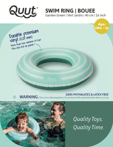 Małe kółko do pływania belgijskiej marki Quut to praktyczne rozwiązanie, zapewniające dzieciom bezpieczną wodną rozrywkę, na plaży, w basenie, w ogrodzie lub na tarasie. Przeznaczone jest dla maluszków od 18. miesiąca życia do 4. roku życia (UWAGA: wyłącznie pod opieką dorosłych!). Wykonane z bardzo wytrzymałego winylu, zachwyca niebanalnym designem i kolorystyką. Ma piękne, intensywne kolory: dół jest ciemnozielony, a góra – w jasnoturkusowe i białe paski. Kółko jest idealne do oswajania malucha z wodą, wstępu do nauki pływania czy relaksu na świeżym powietrzu. Zachęca do aktywności outdoorowych, zdobywania nowych doświadczeń i umiejętności.