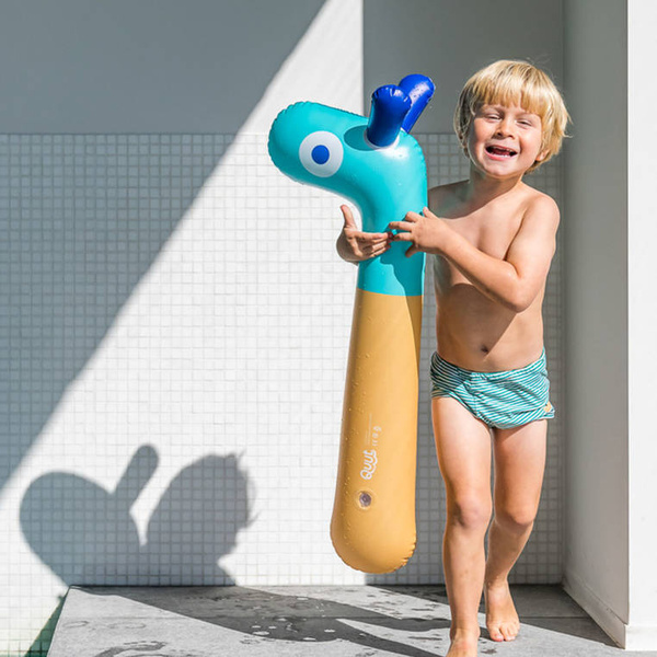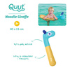Oryginalny, sporych rozmiarów dmuchany makaron do pływania Żyrafa belgijskiej marki Quut to praktyczne rozwiązanie, zapewniające dzieciom bezpieczną i ciekawą wodną (ale nie tylko) rozrywkę, na plaży, w basenie, w ogrodzie lub na tarasie. Przeznaczony jest dla dzieci od 3. roku życia. Wykonany z bardzo wytrzymałego winylu, zachwyca niebanalnym designem i kolorystyką. Ma wydłużony, prosty kształt (przypomina odwrócony kij do hokeja), głowę uroczej żyrafy (oczy i różki) oraz piękne, intensywne kolory: dół jest żółty, góra niebieska, a różki – chabrowe. Zabawka nadaje się idealnie do oswajania dziecka z wodą i relaksu na świeżym powietrzu. Pobudza wyobraźnię i kreatywność, zachęca do aktywności outdoorowych, zdobywania nowych doświadczeń i umiejętności.