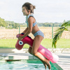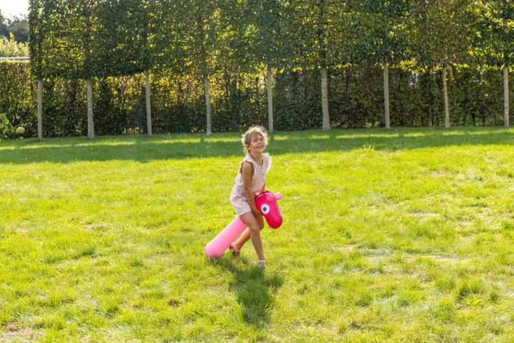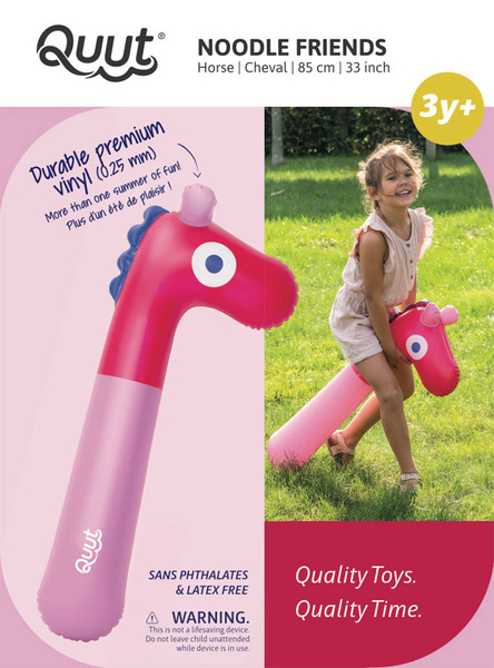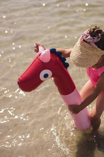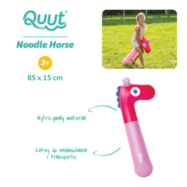 Oryginalny i spory dmuchany makaron do pływania Koń belgijskiej marki Quut to praktyczne rozwiązanie, zapewniające dzieciom bezpieczną i ciekawą wodną (ale nie tylko) rozrywkę, na plaży, w basenie, w ogrodzie lub na tarasie. Przeznaczony jest dla dzieci od 3. roku życia. Wykonany z bardzo wytrzymałego winylu, zachwyca niebanalnym designem i kolorystyką. Ma wydłużony, prosty kształt (przypomina odwrócony kij do hokeja), głowę uroczego konika (oczy, uszy i grzywa) oraz piękne, intensywne kolory: dół i uszy są jasnoróżowe, góra ciemnoróżowa, a grzywa – chabrowa. Zabawka nadaje się idealnie do oswajania dziecka z wodą i relaksu na świeżym powietrzu. Pobudza wyobraźnię i kreatywność, zachęca do aktywności outdoorowych, zdobywania nowych doświadczeń i umiejętności.