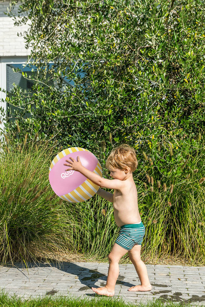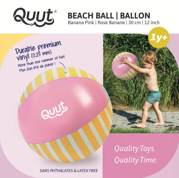 Dmuchana piłka plażowa belgijskiej marki Quut to wspaniała zabawka, zapewniające dzieciom bezpieczną wodną rozrywkę nie tylko na plaży, ale również w basenie, w ogrodzie lub na tarasie. Przeznaczona jest dla dzieci od 2. roku życia. Wykonana z bardzo wytrzymałego winylu, zachwyca niebanalnym designem i kolorystyką. Ma piękne, intensywne kolory: jest na przemian jasnoróżowa i żółta w białe paski. Piłka jest idealna do outdoorowych aktywności, gier i sportów, a także do oswajania dziecka z wodą. Pobudza pomysłowość maluchów i zachęca do zdobywania nowych doświadczeń i umiejętności.