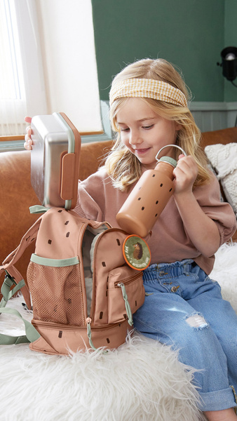 Solidne pudełko śniadaniowe ze stali nierdzewnej niemieckiej marki LASSIG przyda się nie tylko do szkoły, ale również podczas rodzinnych spacerów i wycieczek. Jest pojemne i posiada ruchomą przegrodę, dzięki której można je podzielić na dwie części, np. większą na kanapki, a mniejszą na owoce, krojone warzywa czy inne przekąski. Silikonowa uszczelka wokół pokrywki zapewnia pojemnikowi szczelność, a zamknięcie na szeroki klips uniemożliwia jego samoczynne otwarcie. Pudełko ma ergonomiczny kształt, zmieści się nawet do małego plecaka. Stalowy lunchbox ma pokrywkę i przegrodę w pastelowym, ciepłym odcieniu karmelu, oliwkową uszczelkę i urocze czarne ciapki na zewnętrznej stronie wieczka.