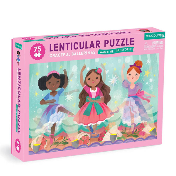Puzzle soczewkowe Baletnice amerykańskiej marki MUDPUPPY nadają układaniu puzzli nowy wymiar – na samym złożeniu obrazka zabawa się bowiem nie kończy. Układanka składa się z 75 elementów, które po ułożeniu tworzą obrazek o wymiarach 45 x 26 cm, przedstawiający trzy pełne gracji baletnice. Dzięki specjalnej technice druku, zwanej drukiem soczewkowym, ilustracja porusza się i „ożywa” w zależności od tego, pod jakim kątem się na nią patrzy – zmienia się nie tylko tło (posiadające efekt głębi 3D), ale też bohaterki, które wykonują różne baletowe triki. Autorką ilustracji jest Kathryn Selbert – ilustratorka, projektantka i kaligrafka z USA. Puzzle wykonane są z materiału w 90% pochodzącego z recyclingu, a nadruk to nietoksyczny tusz na bazie soi. Zapakowane są w estetyczne kartonowe pudełko. Idealnie nadają się na prezent.