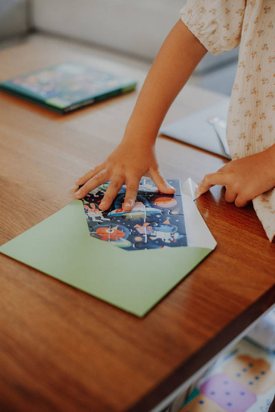 Puzzle-kartka z życzeniami Kosmos amerykańskiej marki MUDPUPPY nadają układaniu puzzli nowy wymiar – zabawa nie kończy się na samym złożeniu obrazka. Ta wyjątkowa układanka o wymiarach 13 x 18 cm składa się z 12 elementów, po ułożeniu przedstawiających przyjęcie urodzinowe w kosmosie, m.in. świętujące ufoludki, zwierzęcych kosmonautów, tort czy podarunki. To jednak jeszcze nie wszystko! Druga strona puzzli-kartki to miejsce na wypisanie własnych życzeń. Dodatkowo do zestawu dołączona jest również koperta. Układanka będzie na pewno niebanalnym dodatkiem do urodzinowego prezentu. Autorem ilustracji jest Amerykanin Bob Kolar – twórca książek, zabawek i programów telewizyjnych dla dzieci. Puzzle wykonane są z materiału w 90% pochodzącego z recyclingu, a nadruk to nietoksyczny tusz na bazie soi.