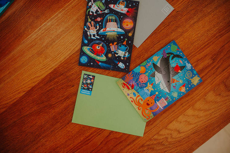 Puzzle-kartka z życzeniami Rekin amerykańskiej marki MUDPUPPY nadają układaniu puzzli nowy wymiar – zabawa nie kończy się na samym złożeniu obrazka. Ta wyjątkowa układanka o wymiarach 13 x 18 cm składa się z 12 elementów, po ułożeniu przedstawiających przyjęcie urodzinowe rekina, m.in. świętujących wraz z nim oceanicznych przyjaciół, tort czy balony. To jednak jeszcze nie wszystko! Druga strona puzzli-kartki to miejsce na wypisanie własnych życzeń. Dodatkowo do zestawu dołączona jest również koperta. Układanka będzie na pewno niebanalnym dodatkiem do urodzinowego prezentu. Autorem ilustracji jest Amerykanin Bob Kolar – twórca książek, zabawek i programów telewizyjnych dla dzieci. Puzzle wykonane są z materiału w 90% pochodzącego z recyclingu, a nadruk to nietoksyczny tusz na bazie soi.