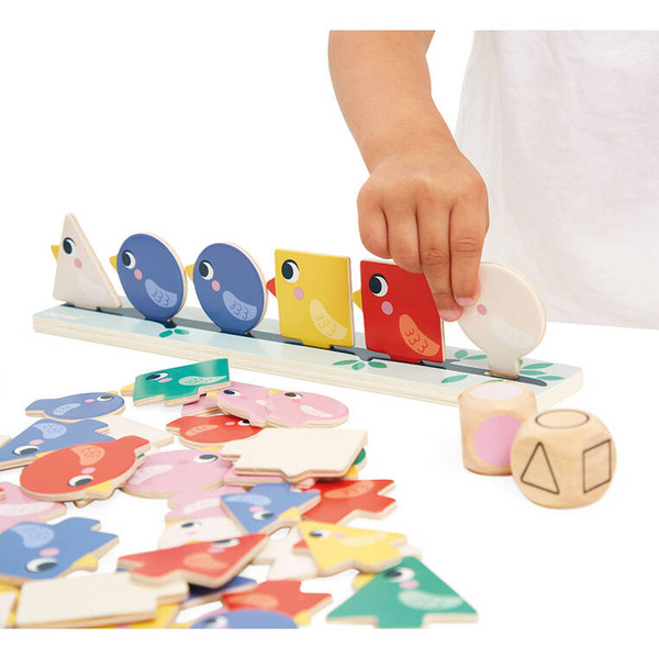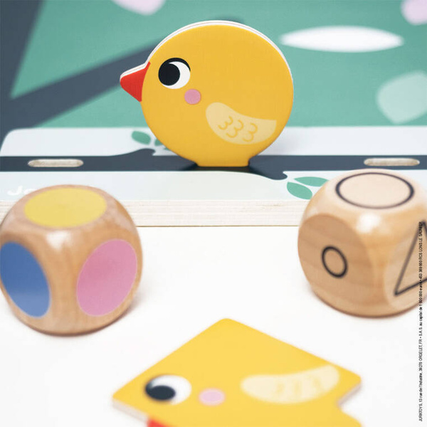 Drewniana układanka edukacyjna Ptaki francuskiej marki JANOD to zabawka, która umożliwia sortowanie wg kształtów, kolorów i rozmiarów. Rozwija przy tym wiele kluczowych umiejętności, m.in. rozróżnianie i dopasowywanie do siebie przedmiotów czy tzw. małą motorykę. Uczy także skupienia, spostrzegawczości i cierpliwości. Zestaw składa się z dwóch podłużnych drewnianych podstawek-gałązek z 6 otworami każda, w których można umieszczać wybrane elementy, zgodnie ze wskazówkami, 72 ptaszków w różnych wielkościach, kolorach i kształtach geometrycznych oraz dwóch kostek do rzucania: jednej, wskazującej kolor i drugiej – kształt oraz wielkość elementów, które należy ustawiać na podstawce lub podstawkach. Zabawką można się bawić w pojedynkę lub we dwójkę, ścigając się lub stawiając sobie wzajemnie wyzwania.