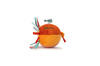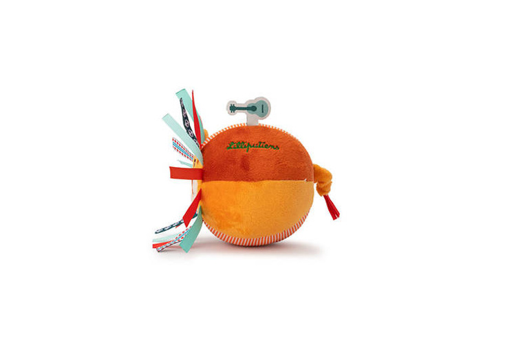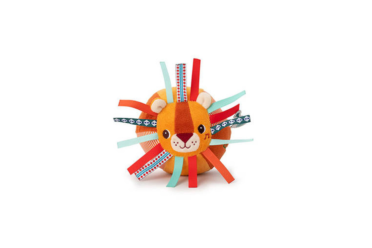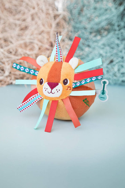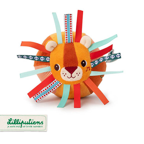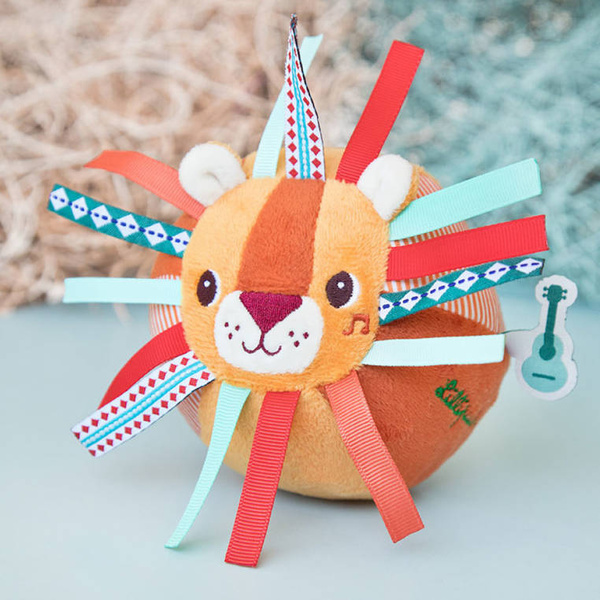 Piłeczka sensoryczna z kolekcji Lew Jack belgijskiej marki Lilliputiens to miękka aktywizująca zabawka dla niemowląt. Piłeczka ma wewnętrzny dzwoneczek i 15 stymulujących wypustek-tasiemek, a na jednej z nich – także naszywkę z gitarą. Uszyta jest z różnych materiałów w kolorze pomarańczowym, zdobi ją również głowa Lwa Jacka z małymi uszkami. Jest poręczna i całkowicie bezpieczna. Odpowiada na potrzebę turlania i rzucania przedmiotów, co jest naturalnym etapem rozwoju maluszka. Rozwija małą motorykę (chwytanie i potrząsanie), aktywizuje zmysł dotyku i słuchu (dzwoni).
