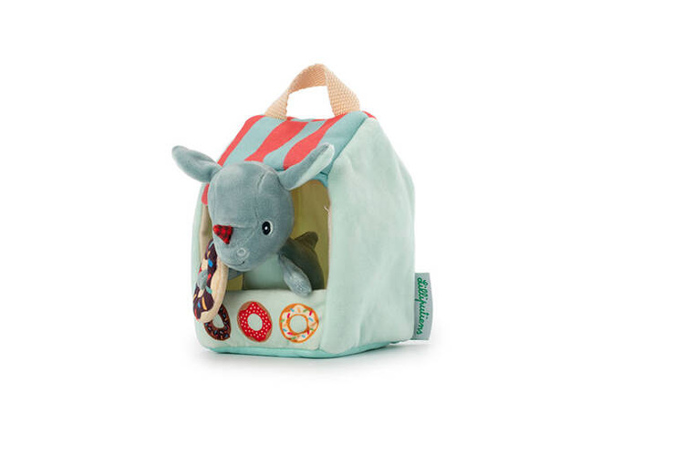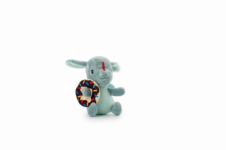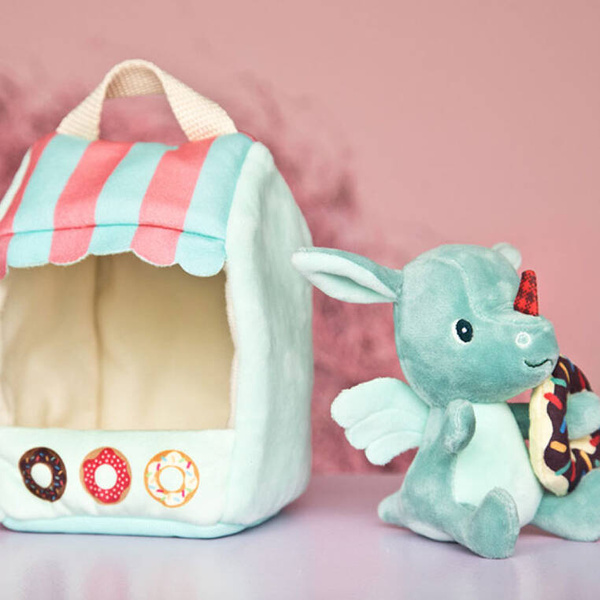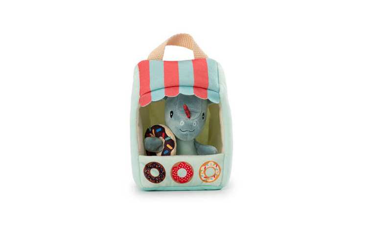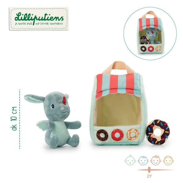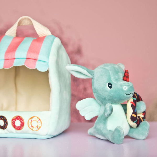 Sklepik z donutami Smoka Joe belgijskiej marki Lilliputiens to niebanalna, miękka zabawka z wieloma elementami, angażująca dziecko na wiele godzin. W skład zestawu wchodzi jasnozielona budka z lodami z daszkiem-markizą w wiśniowo-turkusowe pasy, mieszcząca się za ladą przytulanka smok oraz donut z polewą czekoladową i posypką. Wszystkie elementy są miękkie i uszyte z materiałów o różnorodnych fakturach i wzorach. Sklepik ma wygodną szeroką rączkę do przenoszenia. Zabawka jest solidnie wykonana i bezpieczna. Pobudza dziecięcą wyobraźnię, zachęca do snucia opowieści, odgrywania ról i odtwarzania sytuacji, znanych z codziennego życia. Rozwija małą motorykę (chwytanie, wkładanie, wyjmowanie), aktywizuje zmysły (wzrok, dotyk) i pomaga trenować zdolności poznawcze.