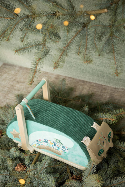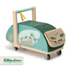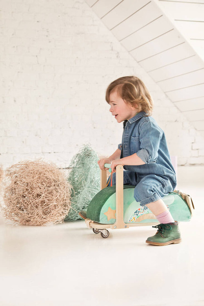 Drewniany jeździk z kolekcji Smok Joe belgijskiej marki Lilliputiens to niebanalna zabawka, która wspiera dziecko w rozwoju ruchowym. Ma drewnianą bazę z rączką i siedzisko o zaokrąglonym kształcie, pokryte miękkim sztruksem w kolorze ciemnej zieleni, a na bokach – wzorem skrzydeł i gwiazd z tkanin w barwach kolekcji (jasna zieleń, ciepły beż i wzór kwiatowy). Ergonomiczna budowa i optymalna wysokość ułatwiają dziecku samodzielne wsiadanie i zsiadanie oraz gwarantują wygodę jazdy. Lekka konstrukcja sprawia, że pojazd jest łatwy do prowadzenia. Ma także stabilne i szeroko rozstawione kółka (dwa skrętne), które nie rysują podłogi w domu. Siedzisko jeździka można zdjąć z podstawy i używać jako oryginalnego dziecięcego krzesełka. Przy uchwycie kierownicy zamontowany jest dzwoneczek, a w tylej części – torba z ekosóry na skarby malucha (odczepiana), ozdobiona haftowaną podobizną smoka Joe. Zabawka jest solidnie wykonana, bezpieczna i estetyczna. Jazda takim pojazdem zachęca dziecko do podejmowania wyzwań sprawnościowych, aktywizuje zmysły, uczy utrzymywania równowagi i koordynacji.