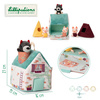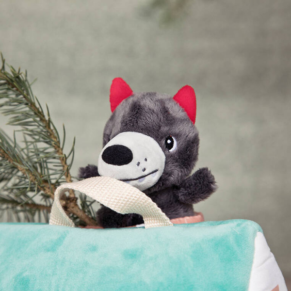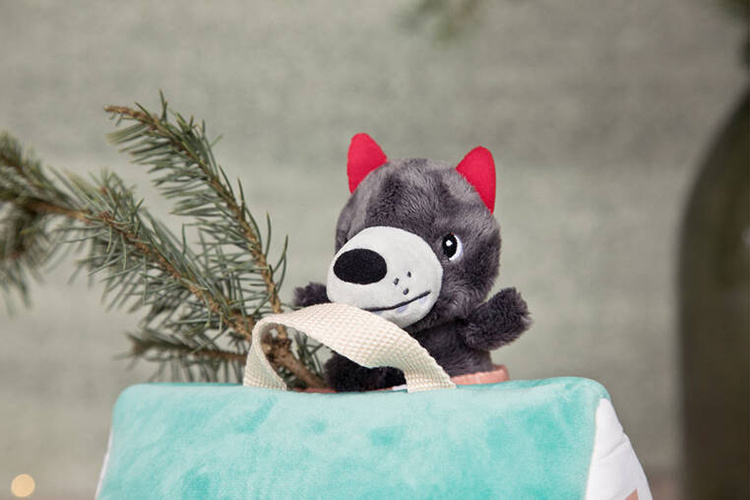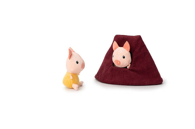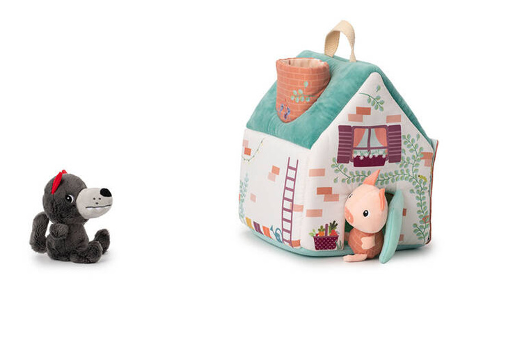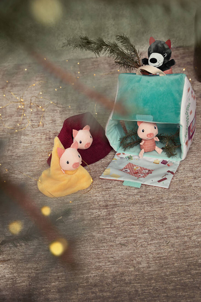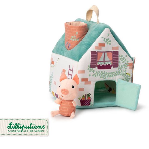 Zestaw domków dla świnek i wilka belgijskiej marki Lilliputiens to niebanalna, miękka zabawka z wieloma elementami, angażująca dziecko na wiele godzin. W skład zestawu wchodzi: wigwam w kolorze żółtym z okrągłym wejściem, namiot w kolorze bordowym z kwadratowym wejściem oraz turkusowy domek z kominem, przez który można wejść do środka, otwieranymi drzwiami i jedną ze ścian z zapięciem na rzep. Znajdują się w nim trzy świnki w ubrankach, których kolory odpowiadają barwom domków oraz wilk. Wszystkie elementy są miękkie i uszyte z materiałów o różnorodnych fakturach i wzorach. Domek ma wygodną rączkę do przenoszenia. Zabawka jest solidnie wykonana i bezpieczna. Pobudza dziecięcą wyobraźnię, zachęca do snucia opowieści, odgrywania ról i odtwarzania sytuacji, znanych z bajek. Rozwija małą motorykę (chwytanie, wkładanie, wyjmowanie, zapinanie, otwieranie), aktywizuje zmysły (wzrok, dotyk), uczy rozpoznawania kolorów i pomaga trenować zdolności poznawcze.