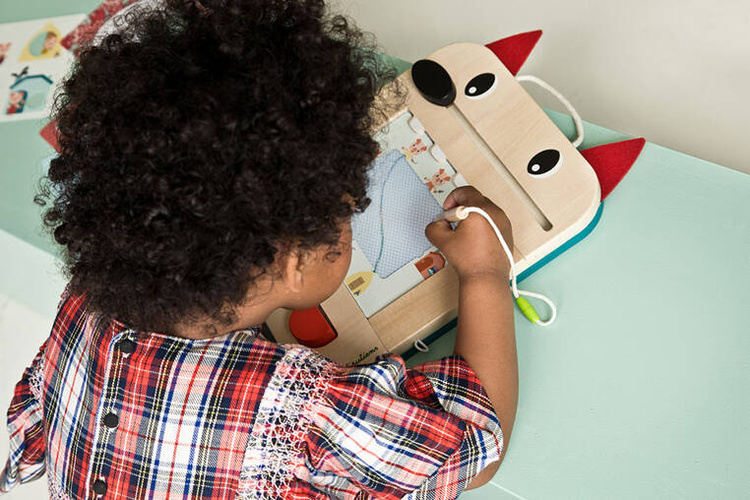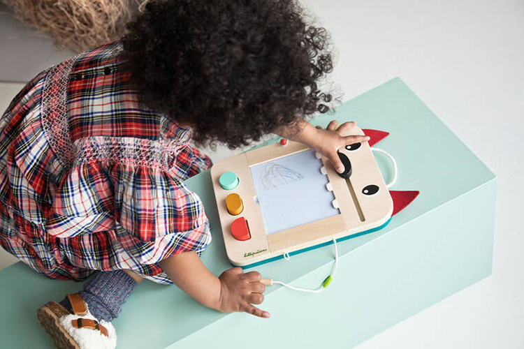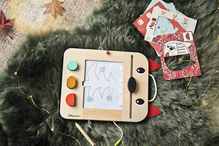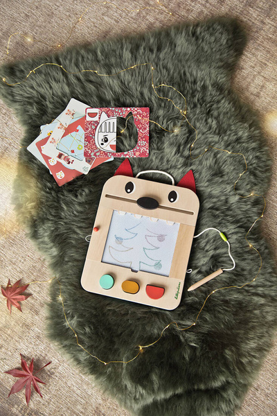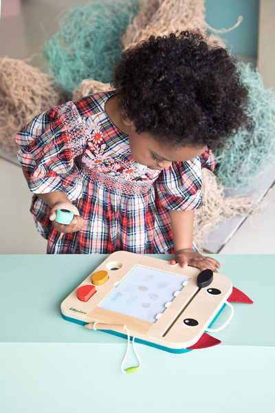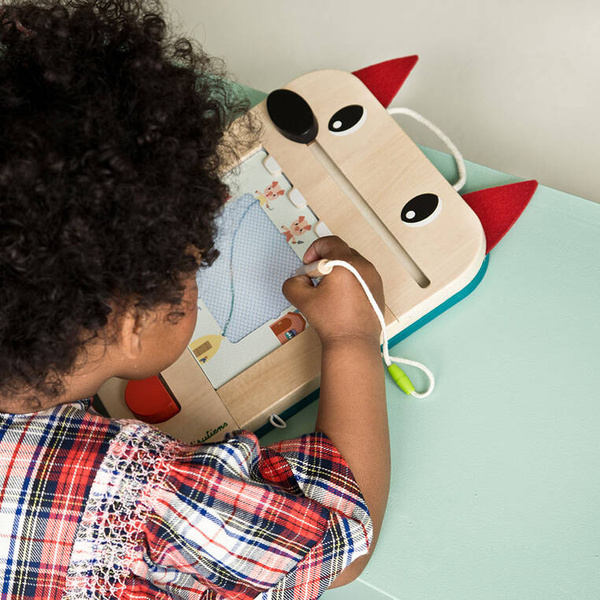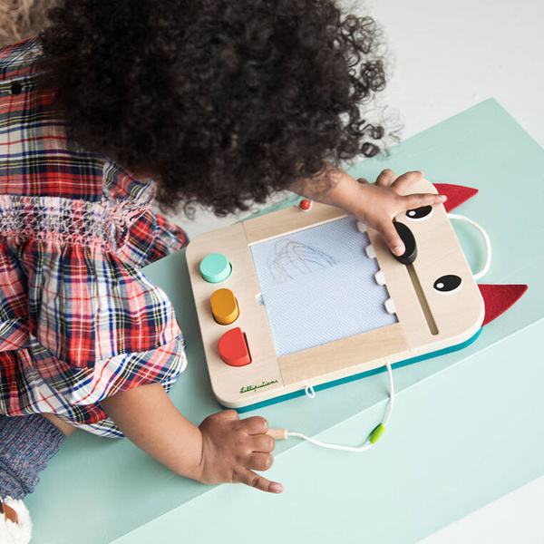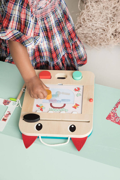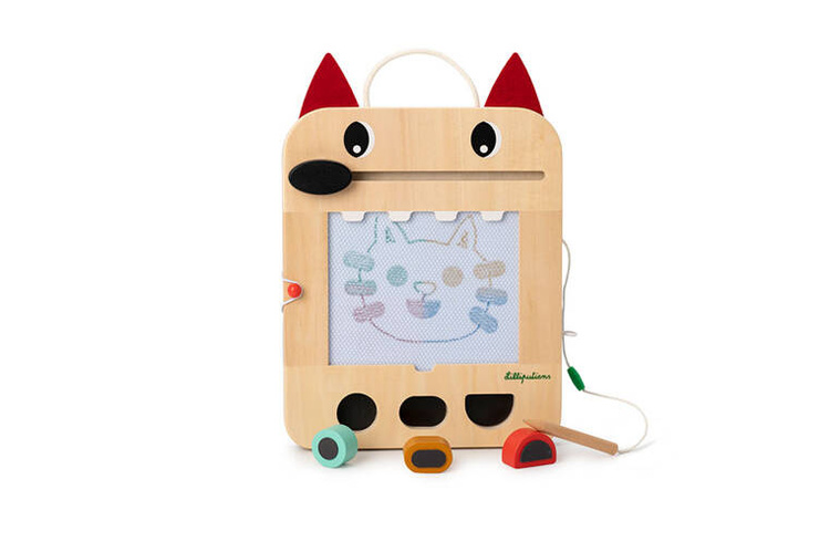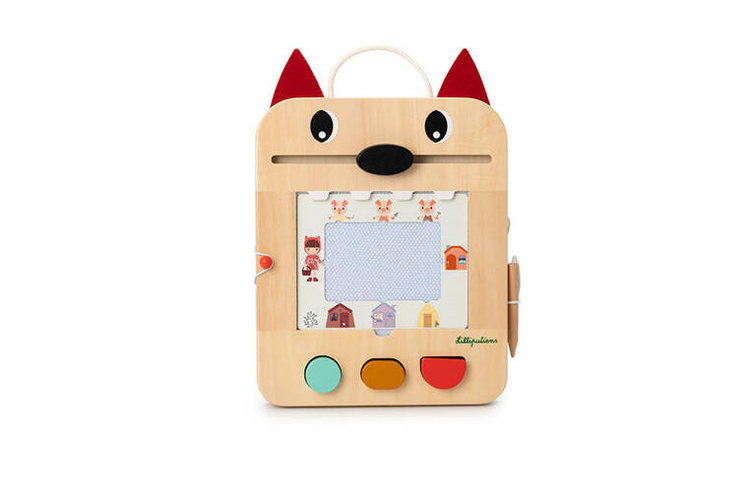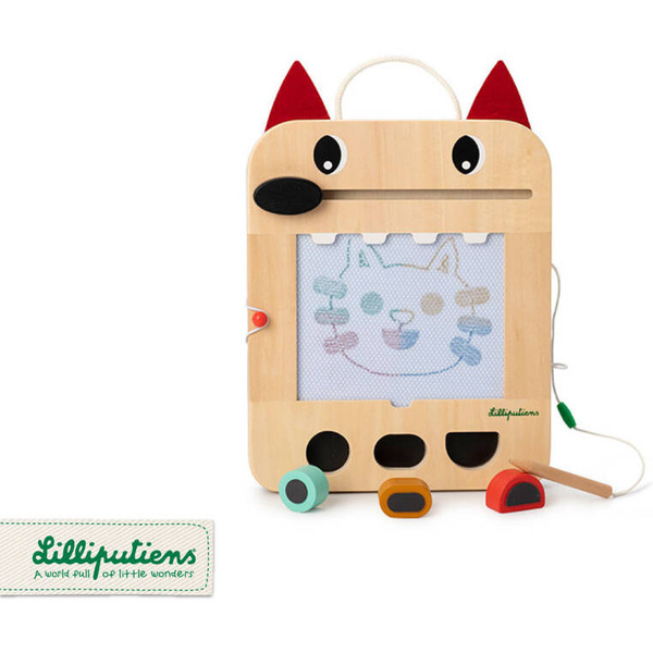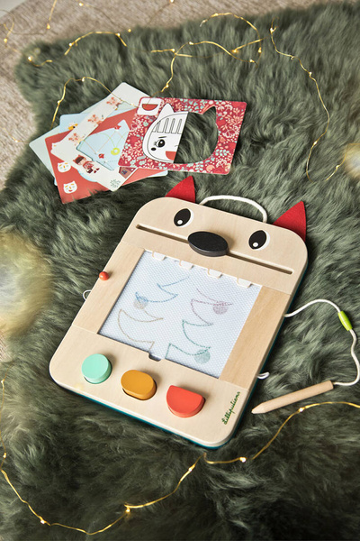 Drewniana tablica-znikopis z kolekcji Wilk Louis belgijskiej marki Lilliputiens to niebanalne źródło rozrywki i nauki dla ciekawskich maluszków. Zabawka ma kształt otwartej paszczy wilka, wnętrze której stanowi ekran, przeznaczony do rysowania. W zestawie znajduje się 6 kart z propozycjami zabaw, 3 magnetyczne klocki w różnych kształtach, które można odciskać na tablicy, pisać nimi lub tworzyć rysunki w różnych kolorach. Miejsce na te magnesy jest w dole planszy. U góry umieszczony jest nos wilka, dzięki przesuwaniu którego można wyczyścić ekran i zacząć od nowa. Tabliczka ma też filcowe wilcze uszy i sznurek do zawieszenia. Została solidnie wykonana, jest w pełni bezpieczna, pomalowana farbami na bazie wody. Zaskakuje i pobudza dziecięcą wyobraźnię. Rozwija koordynację ręka-oko, małą motorykę, aktywizuje zmysł wzroku. Idealnie nadaje się na prezent.