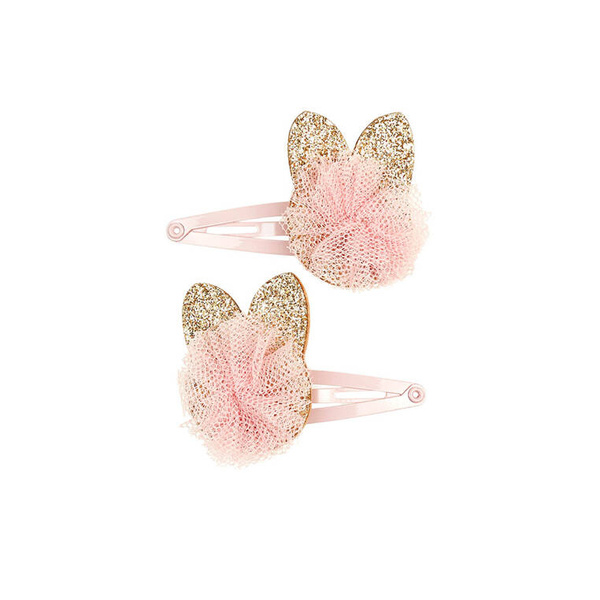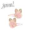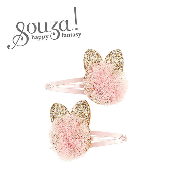 Komplet dwóch spinek do włosów z brokatowymi kotkami Suzan holenderskiej marki Souza! Na każdej z nich znajduje się złota aplikacja w kształcie kotków, ozdobiona dodatkowo tilowym różowym pomponem. Zaciski na klik sprawiają, że ozdoby stabilnie trzymają się włosów. Mają one różowy metaliczny połysk. Idealne zarówno na przyjęcia, jak i na co dzień. Nadają się także na prezent.