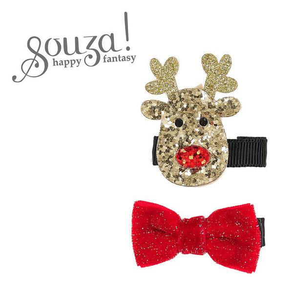 Komplet dwóch świątecznych spinek do włosów Renifer holenderskiej marki Souza! Na jednej z nich znajduje się złota brokatowa aplikacja-renifer, na drugiej – czerwona aksamitna kokardka z połyskującymi drobinkami. Metalowa część spinek pokryta jest czarnym materiałem (rypsową wstążką). Ząbkowane zaciski sprawiają, że ozdoby stabilnie trzymają się włosów. Idealne na okres adwentu i wszystkie świąteczne przyjęcia. Nadają się także na prezent.