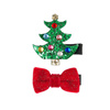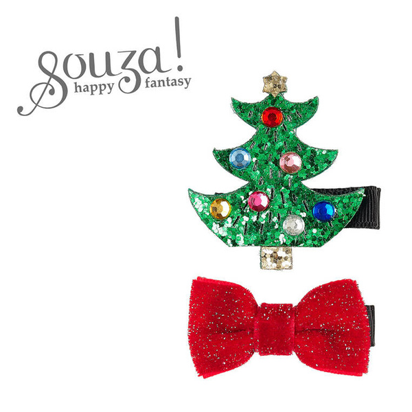 Komplet dwóch świątecznych spinek do włosów Choinka holenderskiej marki Souza! Na jednej z nich znajduje się zielona brokatowa aplikacja-choinka z cekinowymi bombkami, na drugiej – czerwona aksamitna kokardka z połyskującymi drobinkami. Metalowa część spinek pokryta jest czarnym materiałem (rypsową wstążką). Ząbkowane zaciski sprawiają, że ozdoby stabilnie trzymają się włosów. Idealne na okres adwentu i wszystkie świąteczne przyjęcia. Nadają się także na prezent.